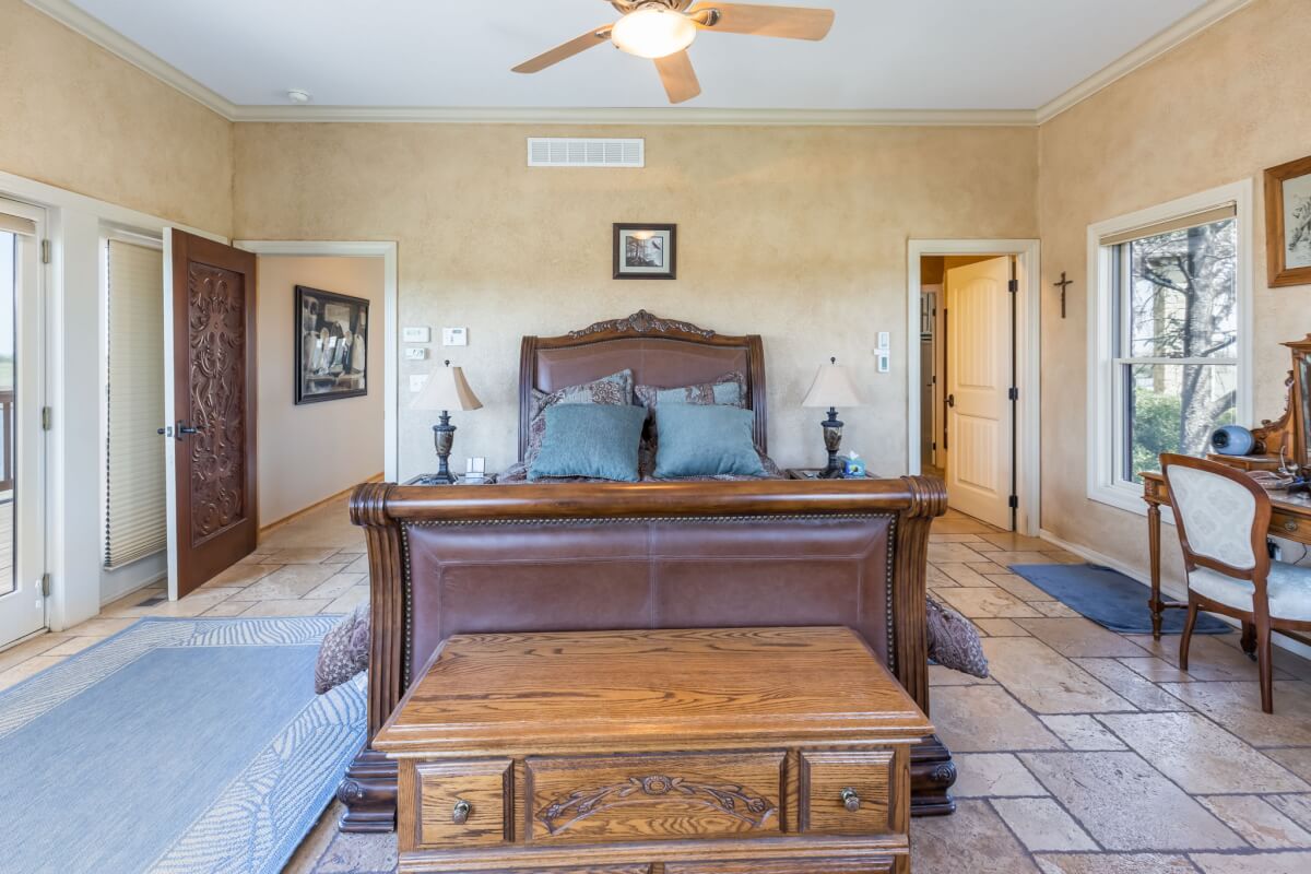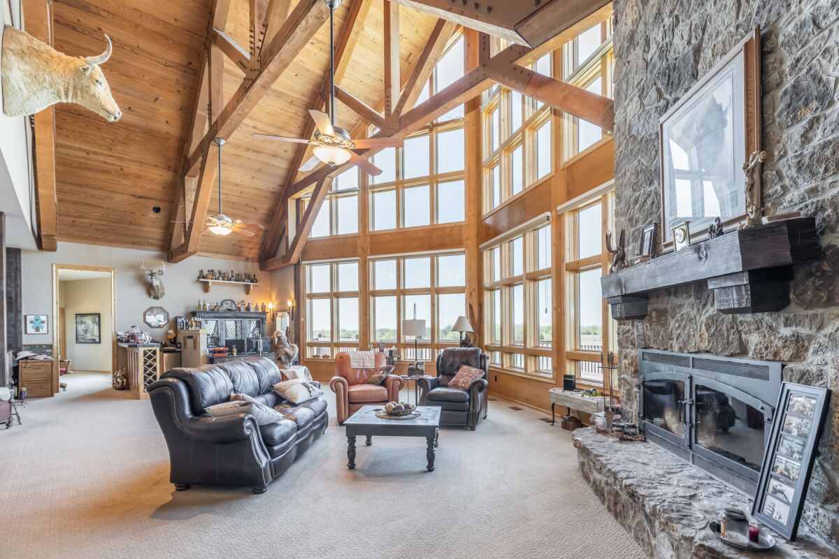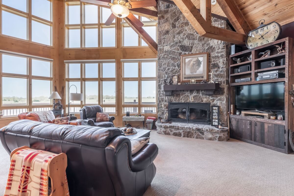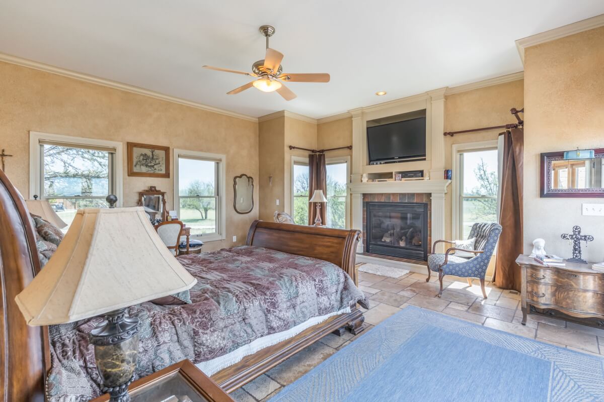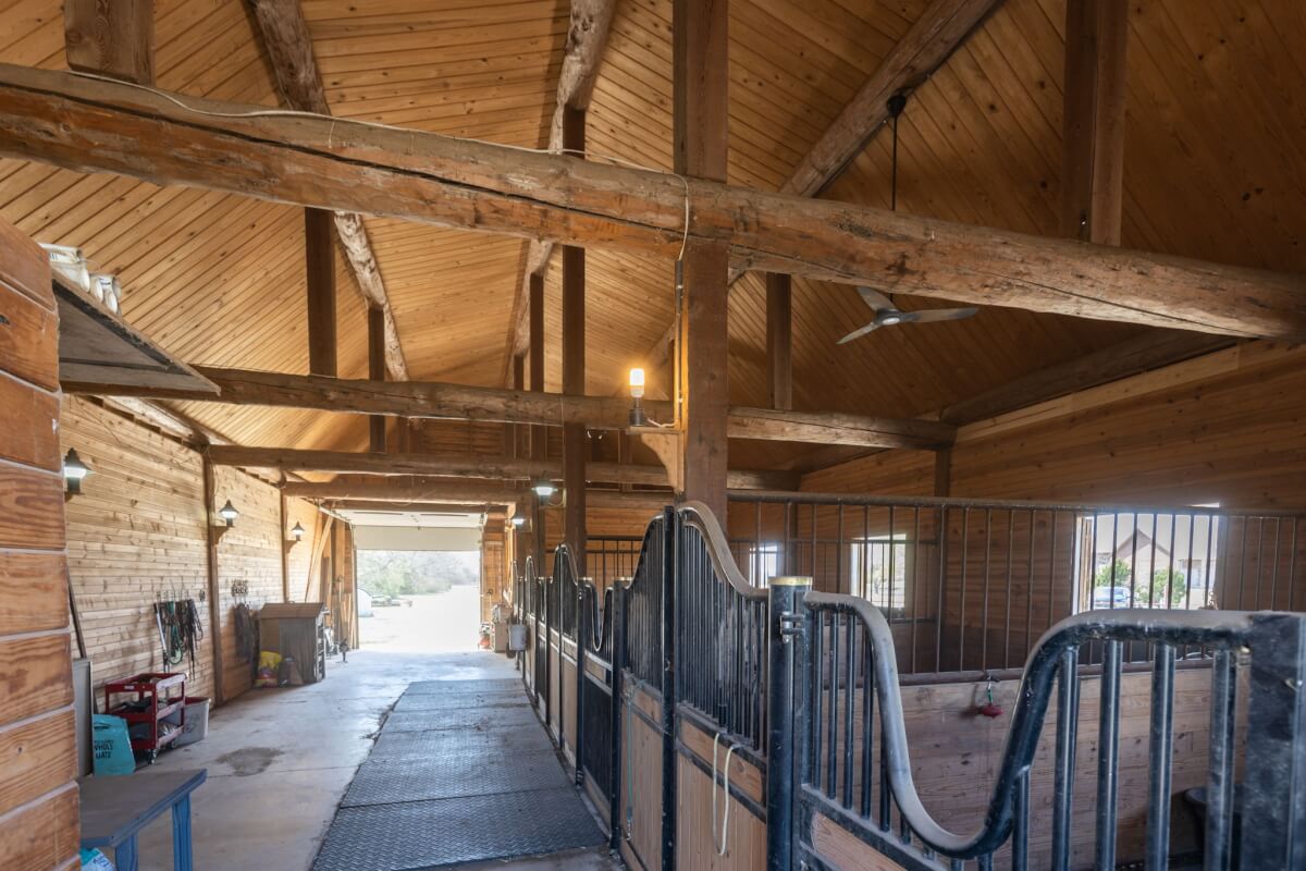 PROPERTY DESCRIPTION: NEW OPTION with additional acreage to own driveway in place. Beautiful gated entry offers secure entry into the private and secluded estate. What an amazing opportunity to own a beautiful house and horse barn on 110 acres in rural Butler County, Kansas east of Douglass. Overlooking an 18+- acre lake, of which a large portion is on this property, you won’t believe the amazing outdoor deck space offering tremendous views of every season! The house was built in 2006 with 3087 square feet of finished living area on the main level, plus another 1713 square feet of finished space in the basement, and a 3 car attached garage. There are currently 3 bedrooms and 5 1/2 baths. Approximately 28′ vaulted ceilings in the main floor living area are a sight to see! This house boasts 3 fireplaces, one in the main living area on each floor plus one in the master bedroom. Both of the living room fireplaces have inserts with blowers. The master bedroom fireplace is gas. Quality is abundant throughout, from the hard surface counter tops and high end stainless steel appliances in the kitchen, to the the beams and stone accents both on the interior and exterior. The horse barn has beautiful finish work both inside and out, with 4 stalls, a tack room, and a feed room. Additional exterior features of the property include good pasture, small creek, small pond, trees, and an area with the ground worked for an outdoor horse riding location. Utilities include a water well, electric, septic system and propane. A survey will be necessary to determine the exact property boundary and acreage.