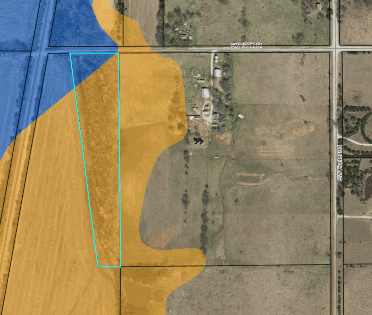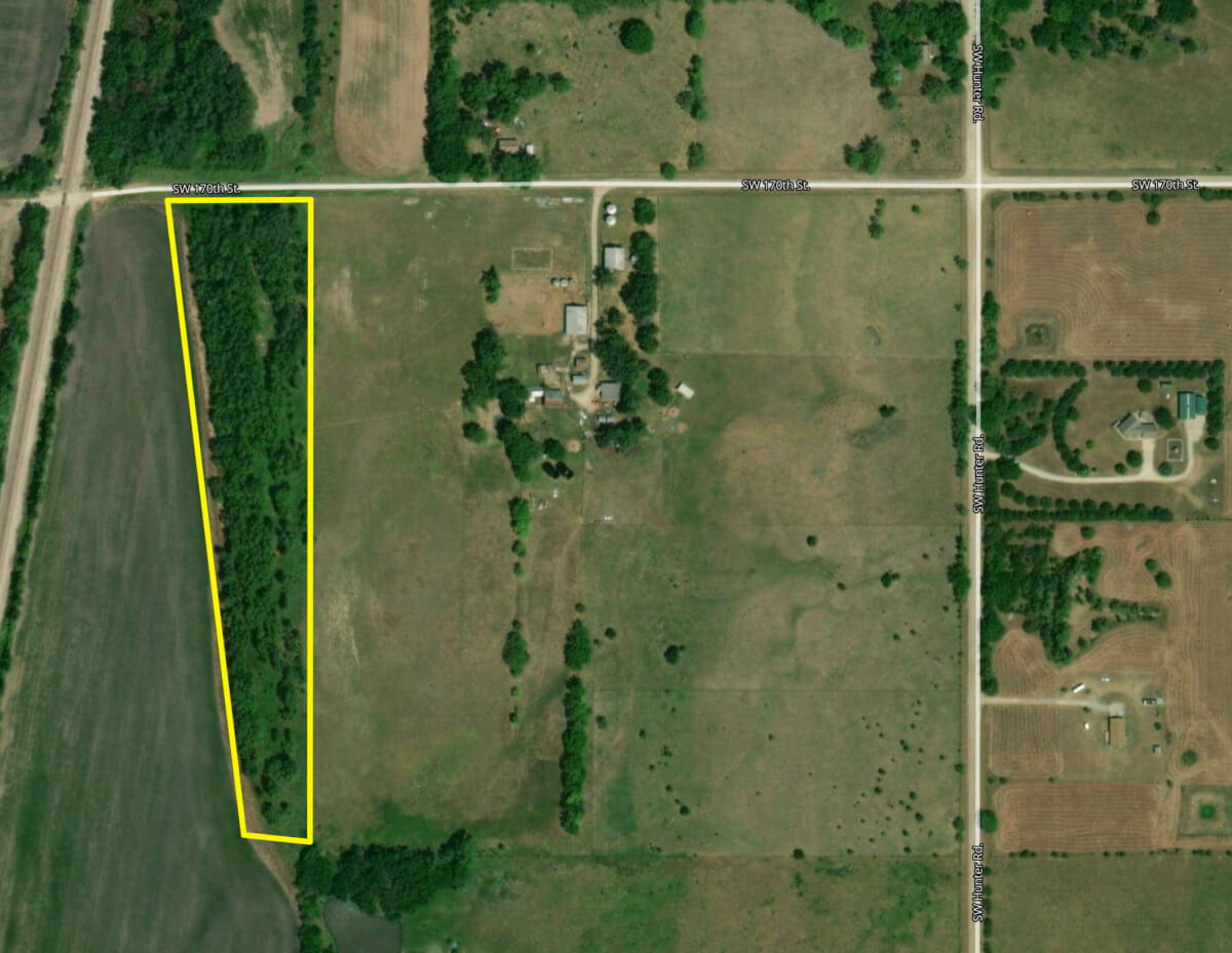 PROPERTY DESCRIPTION: 6.6 acres located just 1.5 miles from HWY 77 and 4 miles north of Douglass and 6 miles south of Augusta Kansas. This property is located at the end of SW 170th offering low traffic and seclusion. Although just 6.6 acres, the property is over 1300 feet long providing a great area for recreation. The majority of the property is in the 500 year floodplane and a small portion is in the 100 year floodplane. This is a unique opportunity to purchase a private small acreage tract in a easy to get to location! Butler Rural Water #4 has a line running along the north boundary!