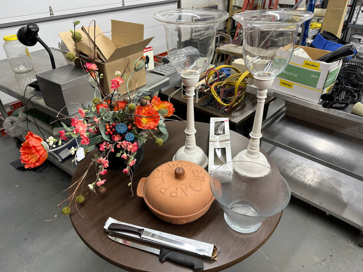 | 154 | Misc Decor and Homewares-Candle Stick (damaged,) Serving Bowl, Knives, Bakeware, Brass Papertowel Holder |