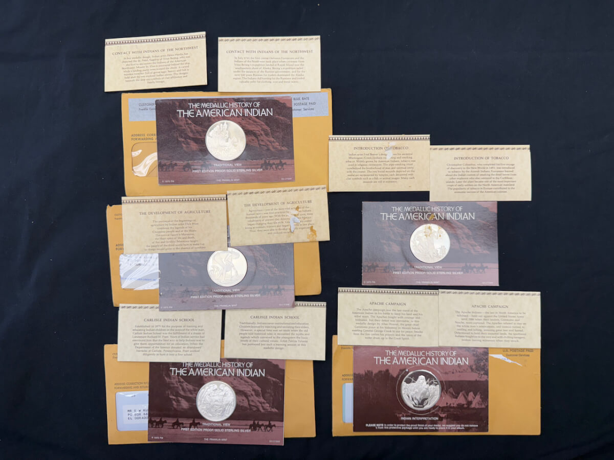 | 12 | (5) American Indian sterling silver coins: Contact with Indians, intro of Tobacco, Apache campaign, development of agriculture, Carlisle Indian school |