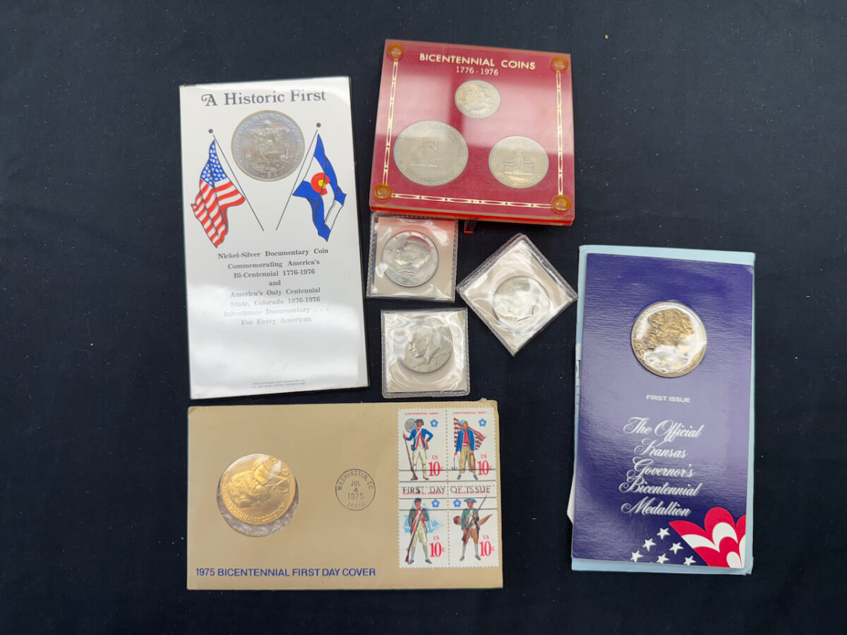 | 23 | 1975 bicentennial first day cover stamps and medal, Nickel Silver documentary coin Colorado, (2) 1974 Kennedy half dollars, 1976 Kennedy half solar, medallion, Commemorative coins |