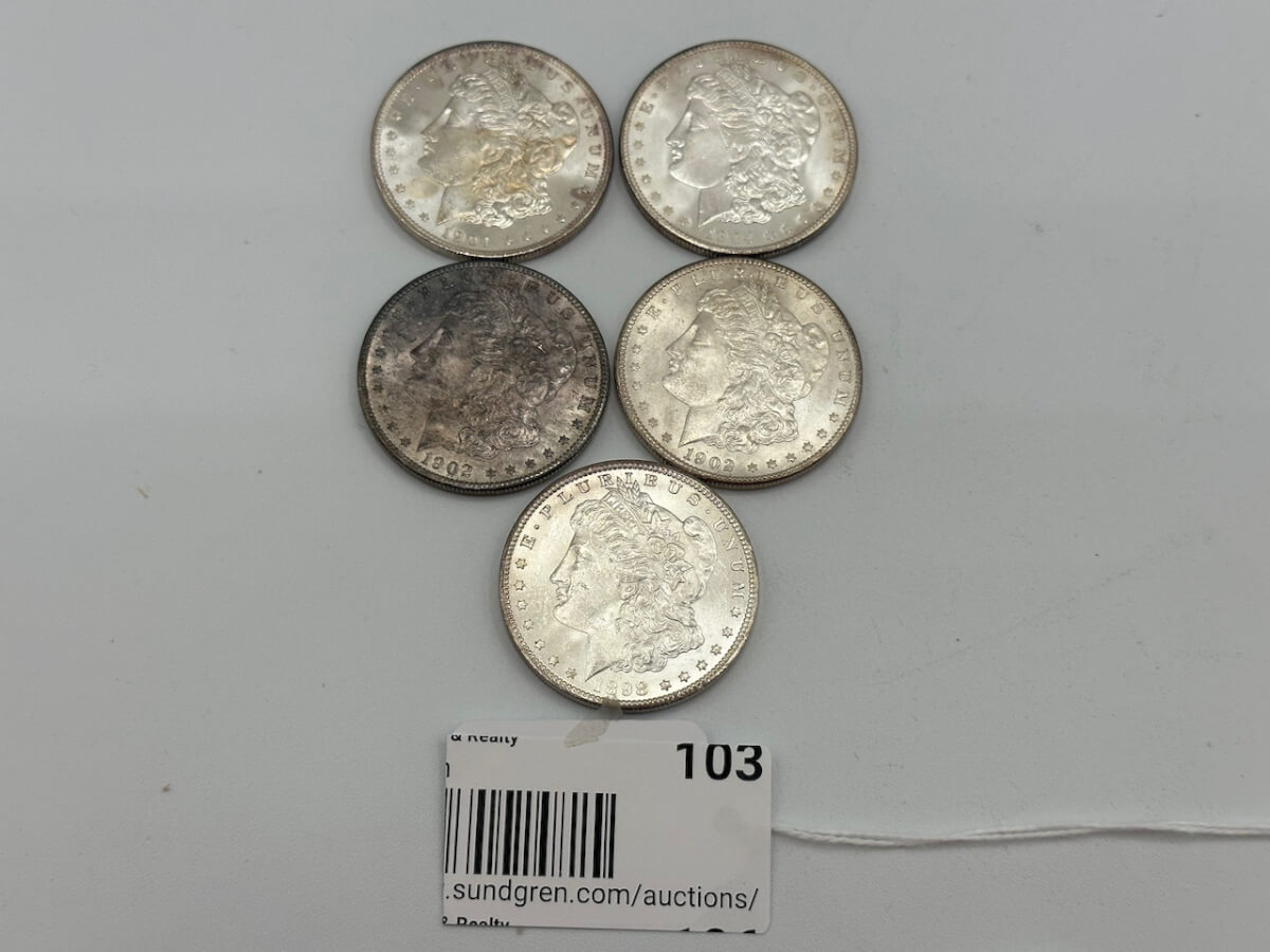 103 (5) 1-1898, 2-1902, 2-1904 Morgan silver dollars