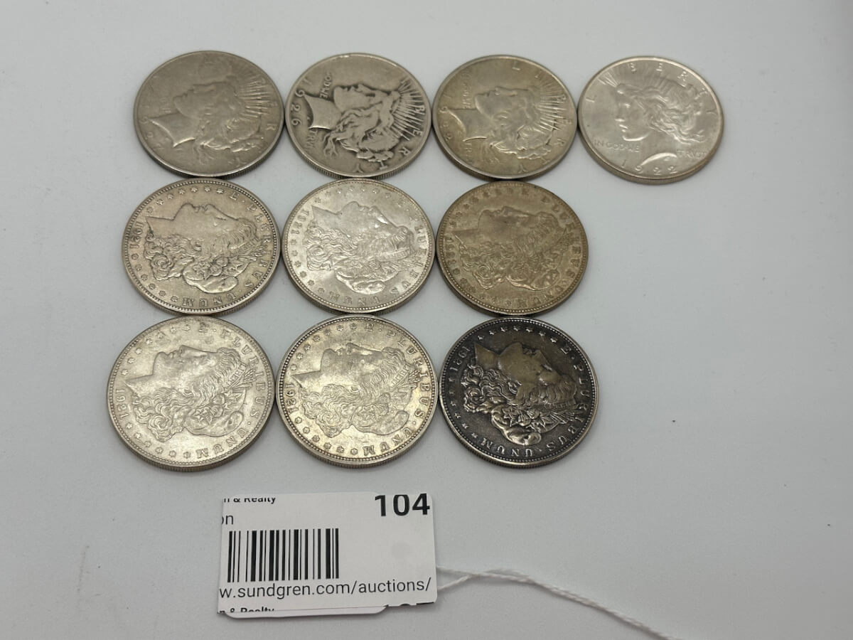 104 (10) 6-1921, 2-1922, 1-1926, 1-1927 Morgan silver dollars