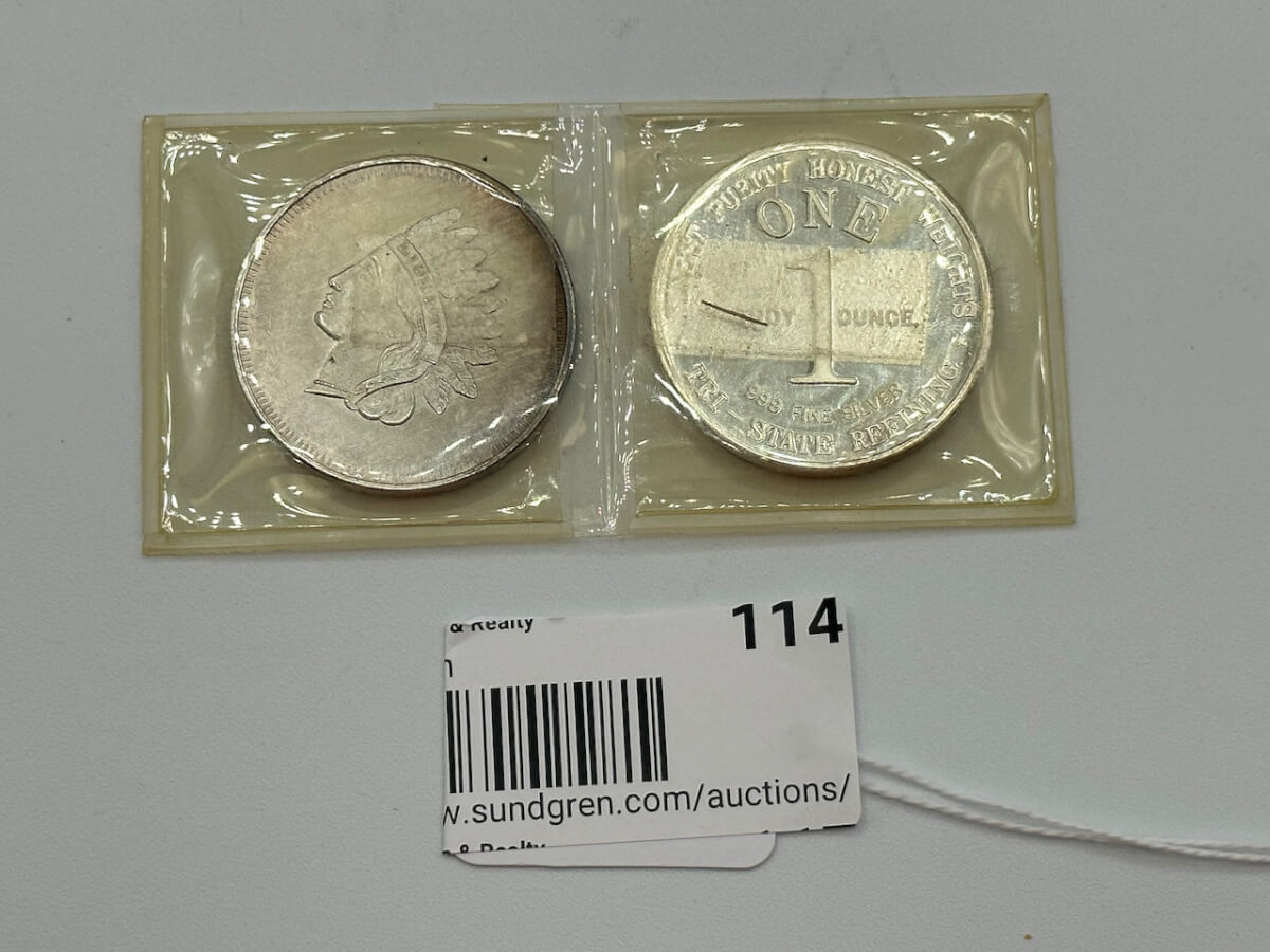 114 (2) pieces-1.) Liberty American Indian Head Round, One Troy Ounce Silver .999, 2.) Finest Purity Honest Weights ONE 1 Troy Ounce .999 Fine Silver Tri-S…