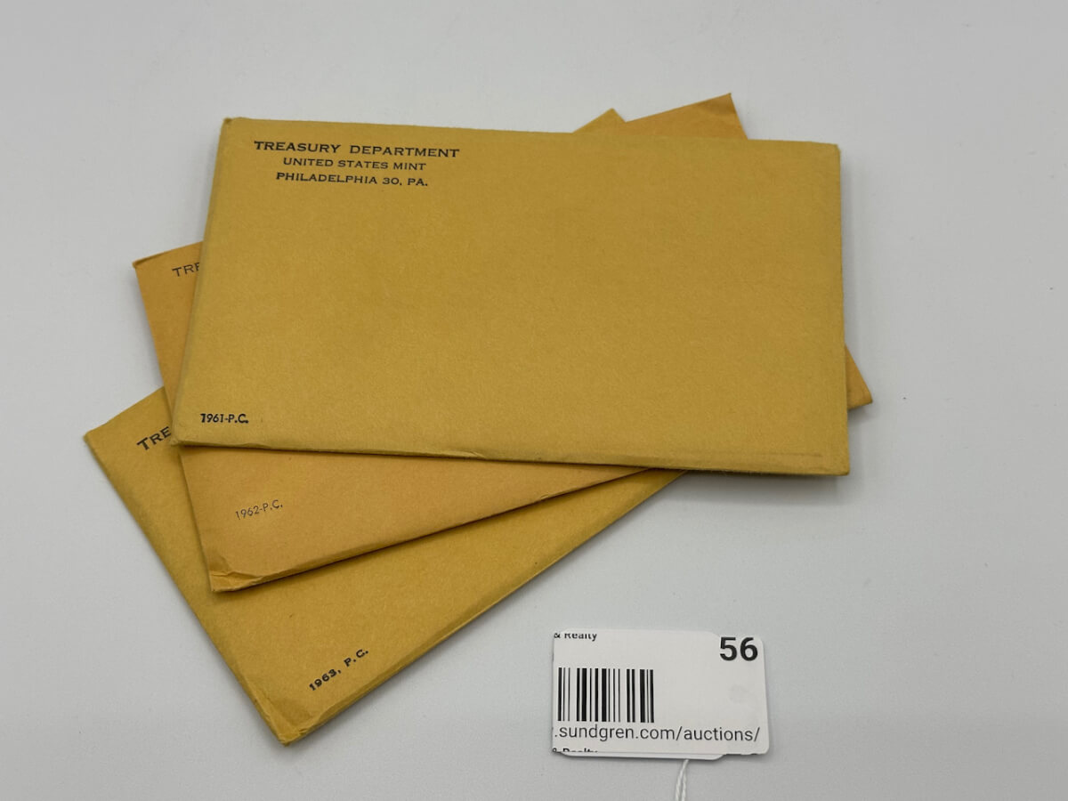56 1961-1963, P.C. Uncirculated Coin sets, 2 unopened envelopes
