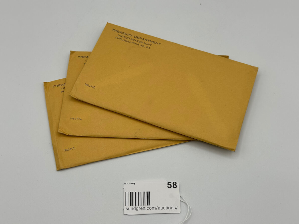 58 (3) 1962, P.C. Uncirculated Coin sets, 3 unopened envelopes