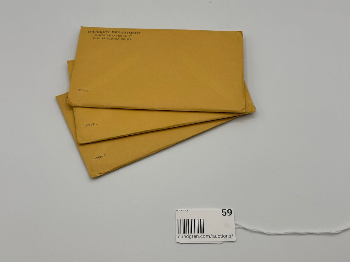 59 (3) 1962, P.C. Uncirculated Coin sets, 3 unopened envelopes