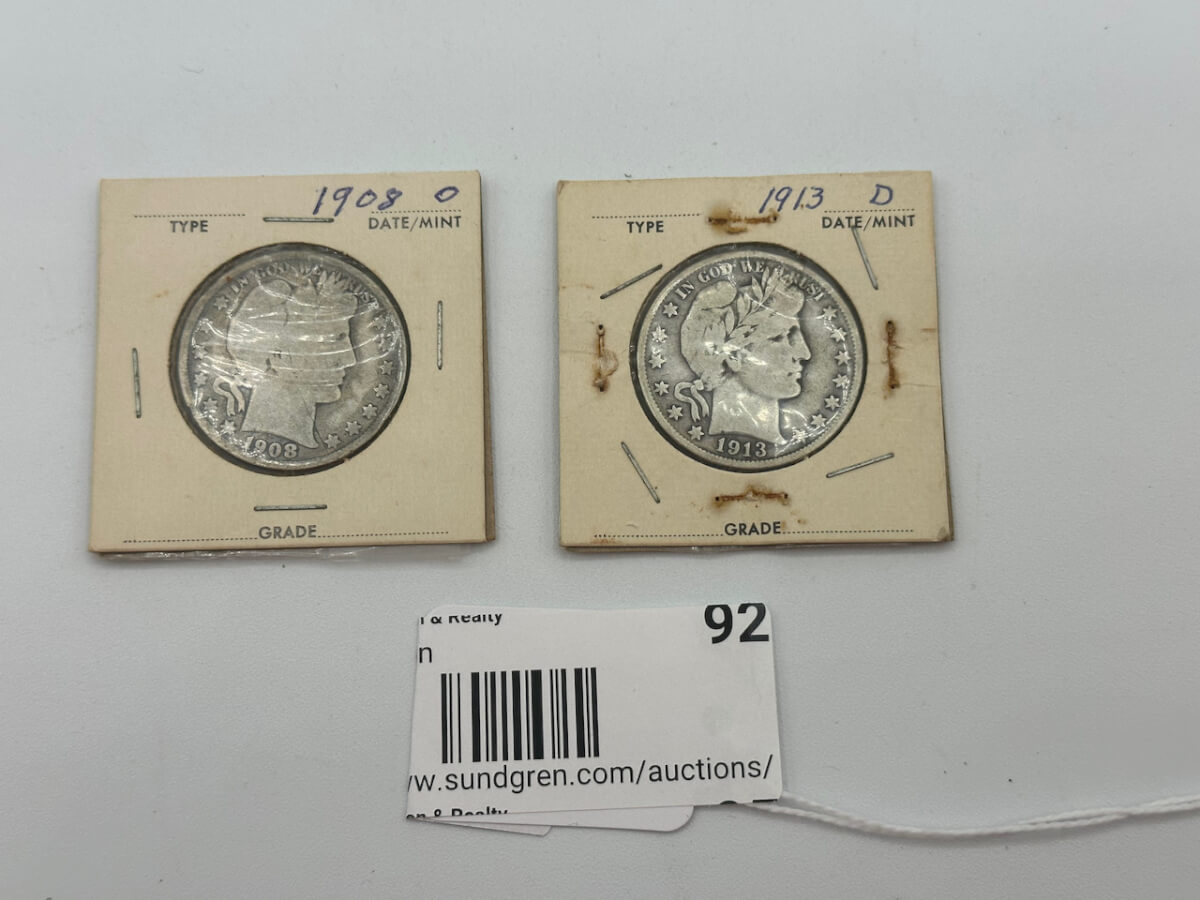 92 (2) 1908, 1913 Barber Silver half dollars