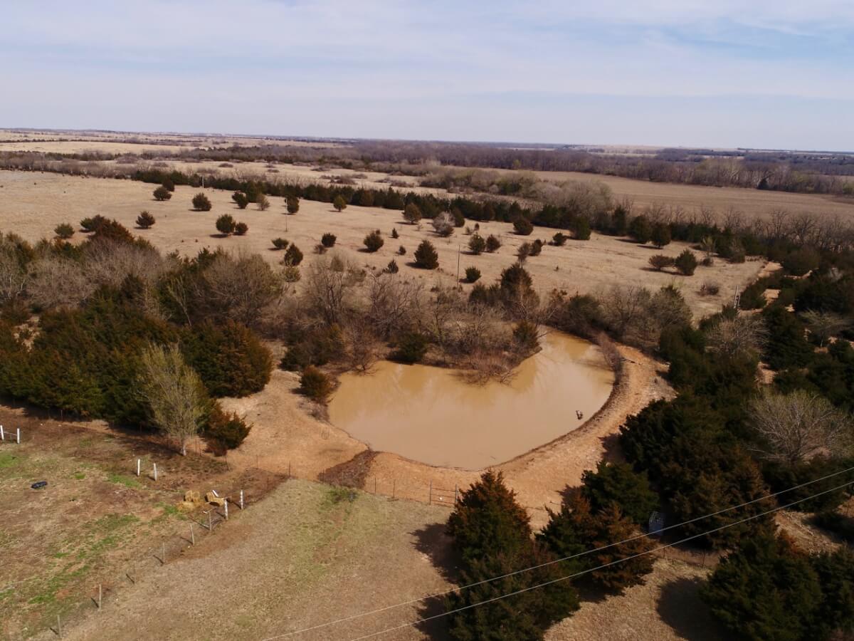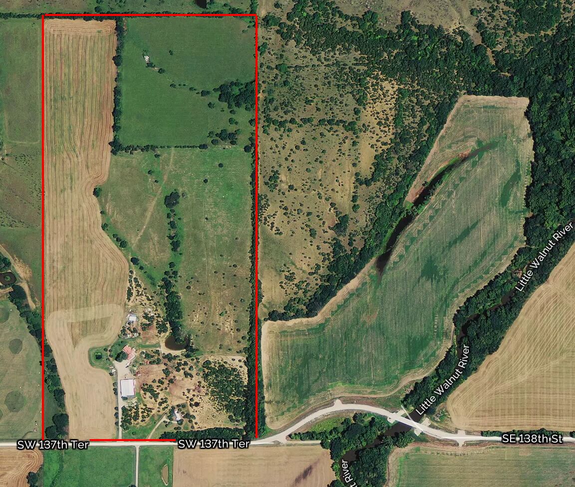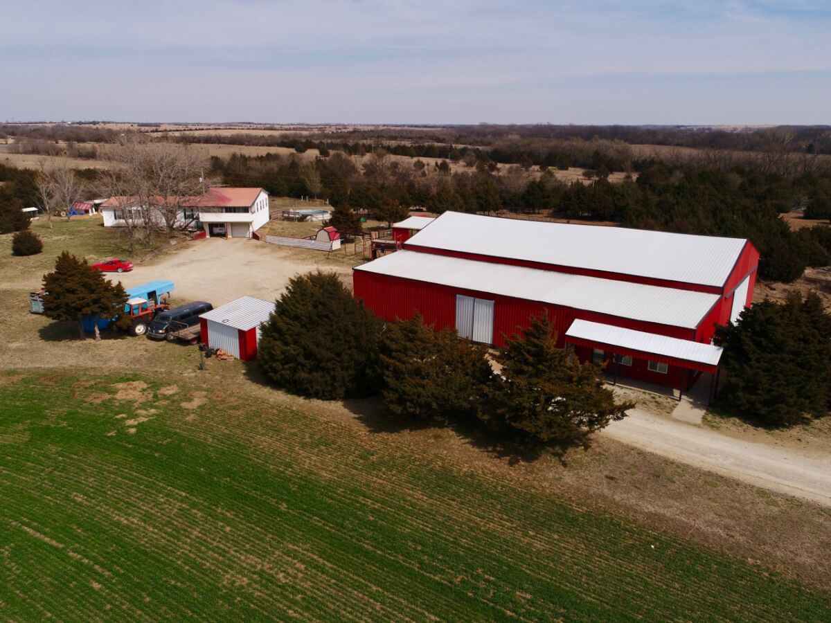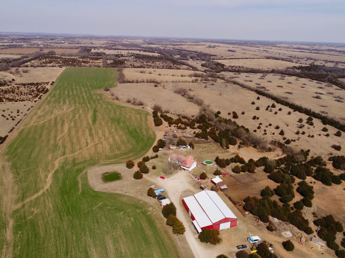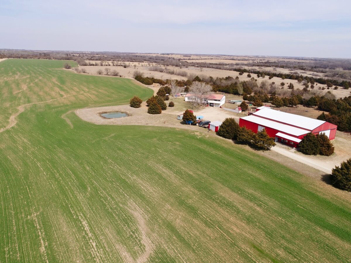PROPERTY DESCRIPTION: 3+ bedroom 4 bath home on 80 acres near Augusta in Butler County, Kansas. The manufactured home has been increased in size with a stick built addition. The basement has 5 rooms that could be used as bedrooms with ingress/egress windows, 3 of which already have windows. Other portions of the addition include a large office with great natural light, and a guest quarters with kitchen and bathroom that is currently used as a school room. The 96′ x 74′ red metal barn has living quarters, hay storage, and a large open area perfect for events and social gatherings. Other misc. utility building offer good storage and shelter for animals and livestock. A large portion of the property is currently planted to wheat. The balance is pasture, timber, and a pond. This property is taxed as two separate parcels, and once had a second home in the southeast corner. Hunting, recreation, & agriculture are all good current and future uses associated with this property.