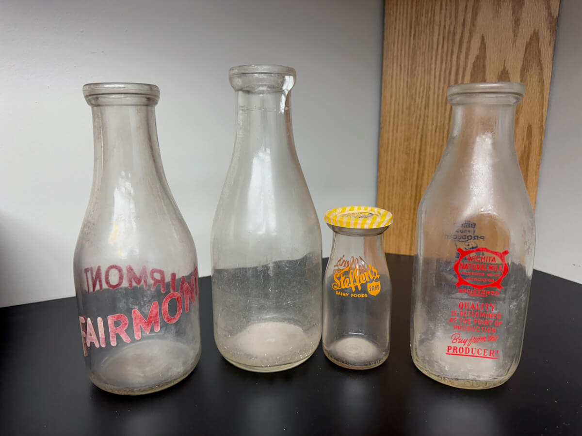 | 128 | (4) milk bottles, Fairmont, Steffens, Wichita Natural Milk |