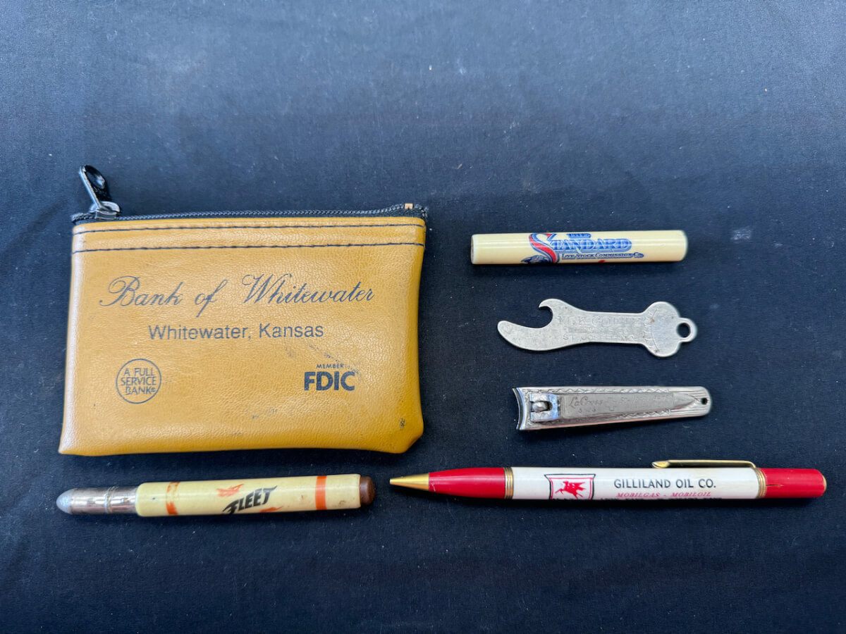 | 42 | (6) items; Bank of Whitewater bag, KT Oil, Standard Oil, Mobilgas, Goetz Brewing, Lacross |
