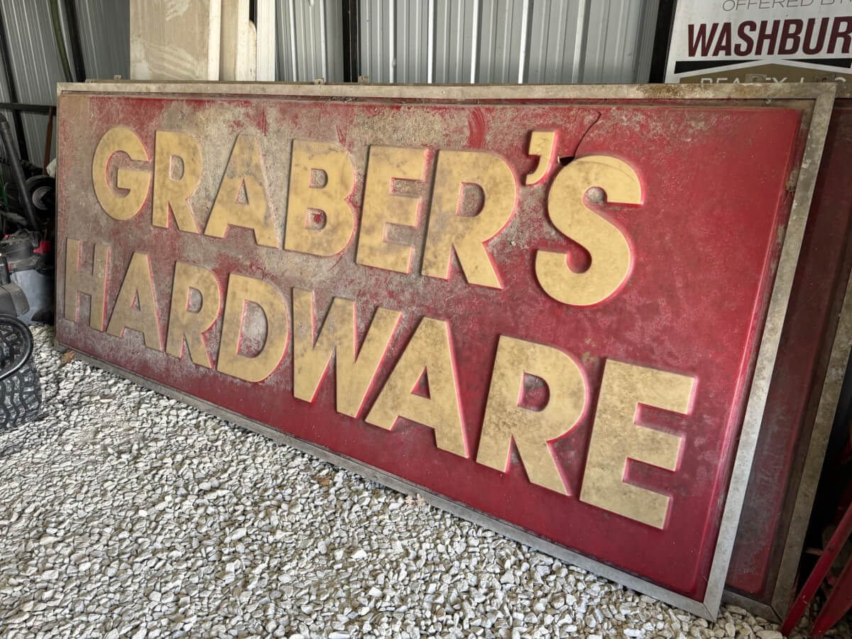 | 100u | (2) Graber’s Hardware Signs, Both Slightly Damaged 60″x144″ |