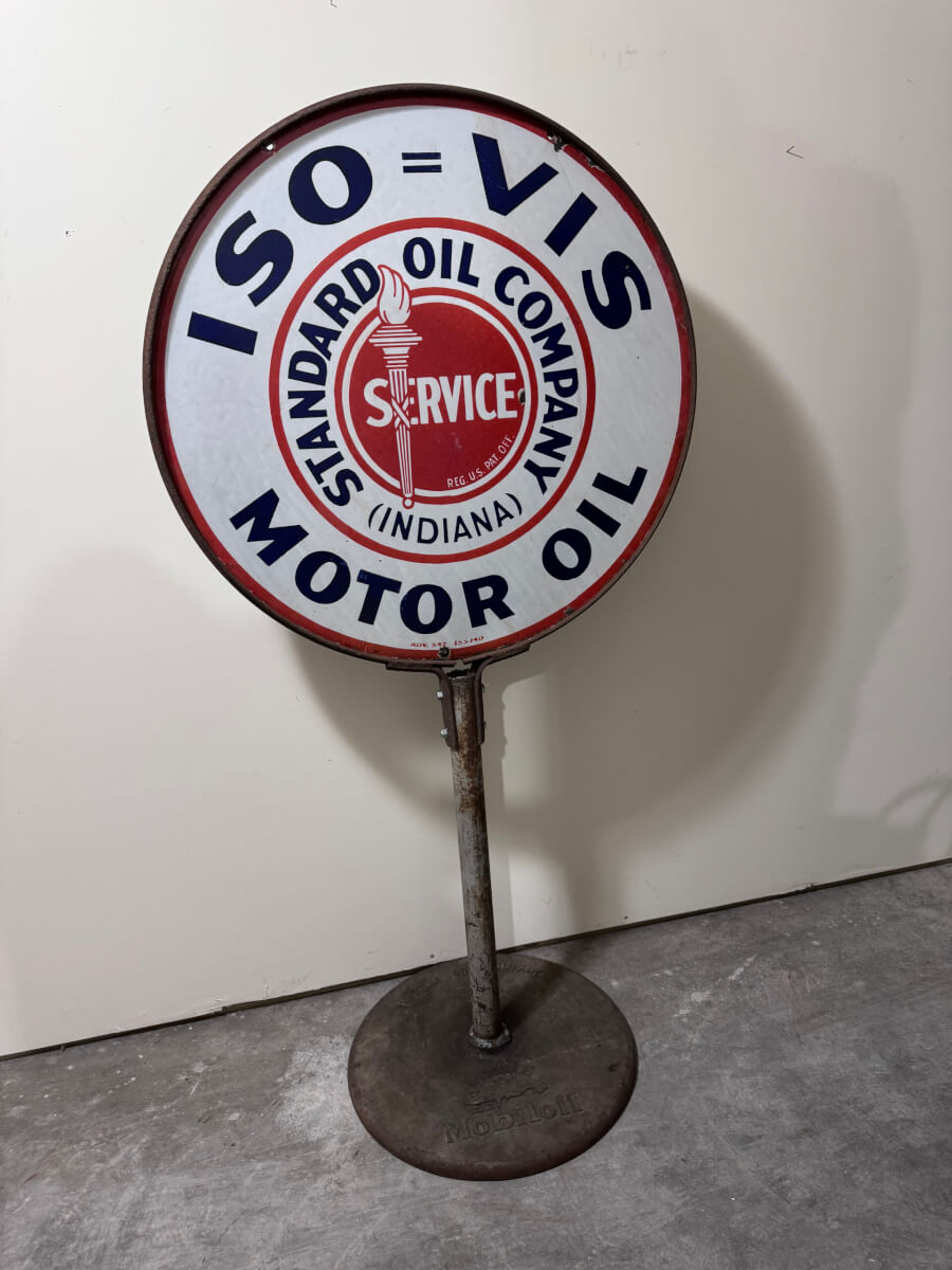 | 46 | Standard Oil Company Iso+Vis – Indiana Lollipop Sign 30″ Diameter, Gargoyle Mobiloil Base |