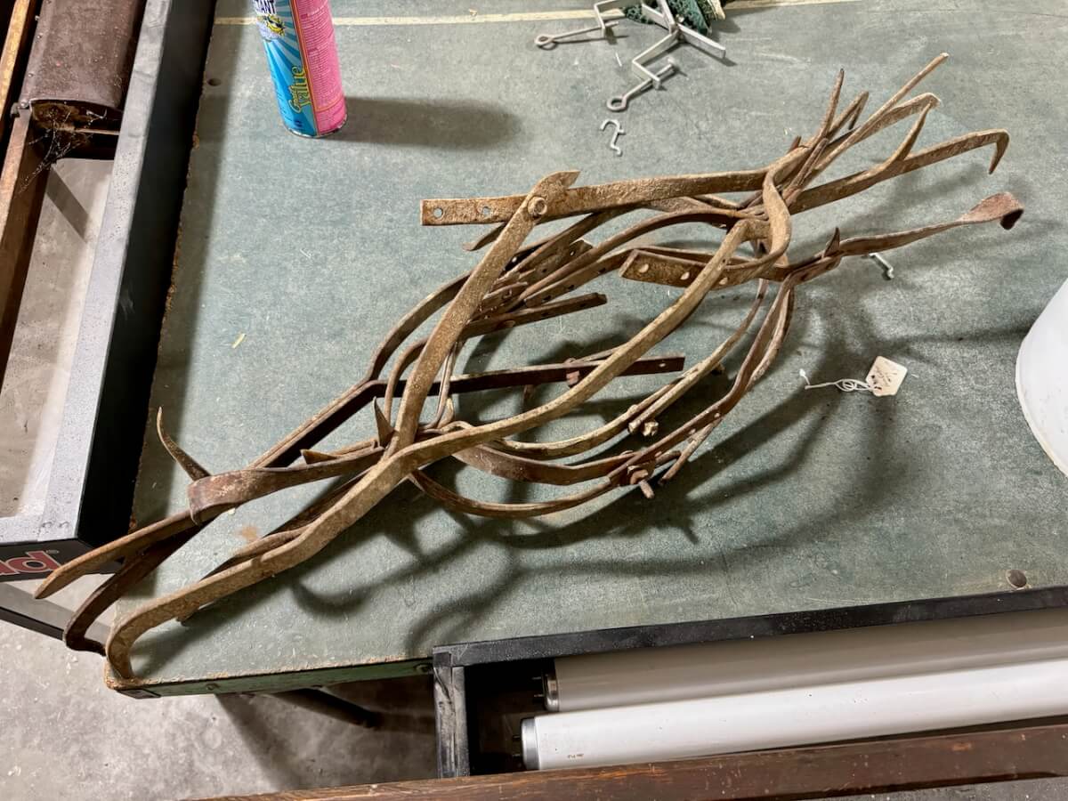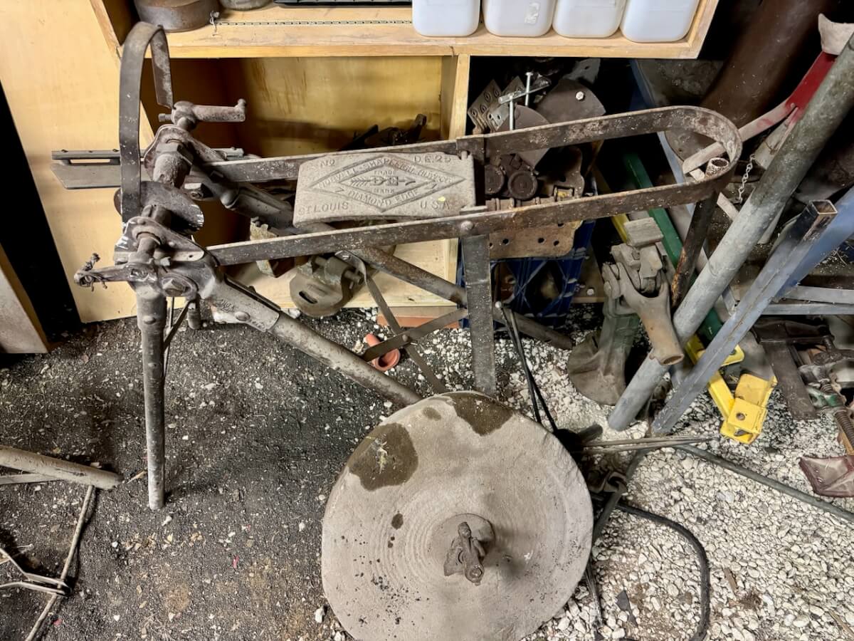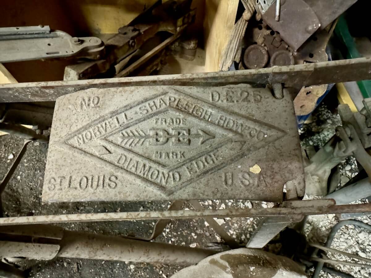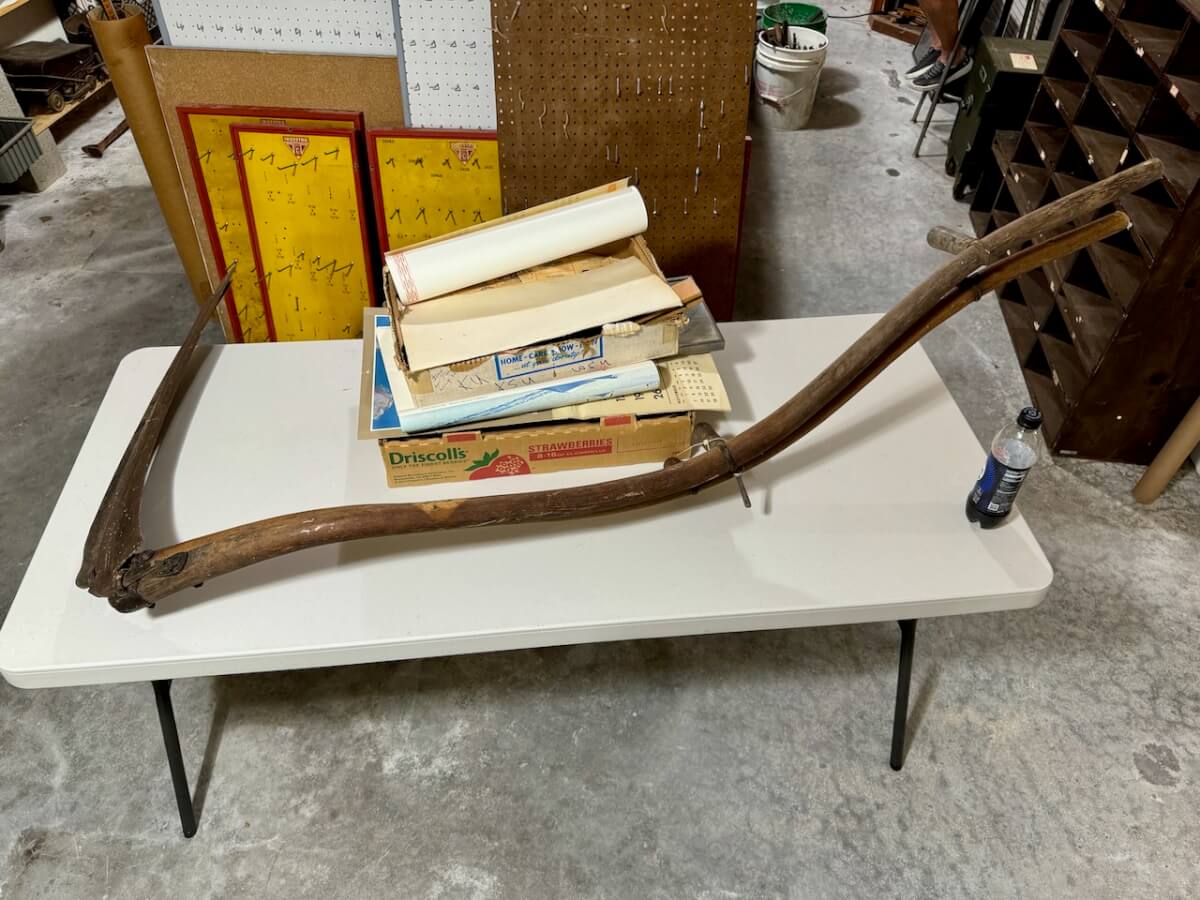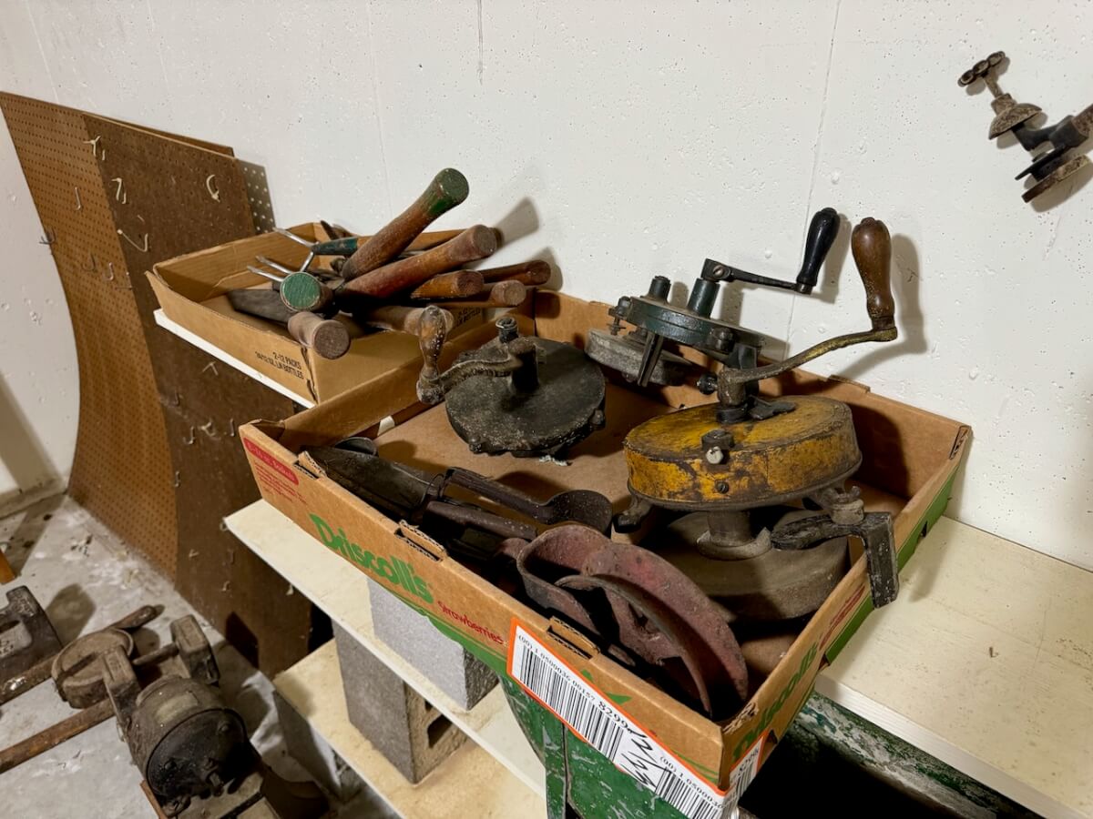 Miscellaneous Tools: Shapleigh scissors – Stanley saw set – Oak Leaf trowel – Winchester potato fork – Keen Kutter shears – Keen Kutter rat trap – Shapleigh rat trap – Stanley scraper – Keen Kutter T bevel – Keen Kutter ruler – Bay State pliers – 2 Keen Kutter grinders – Oak Leaf grinder – Keen Kutter square shovel – Keen Kutter pick – Keen Kutter scythe – Keen Kutter scoop – Keen Kutter weed whip – OVB ax – Winchester double head ax – Keen Kutter sharp shooter – Simmons, AT&SF, Keen Kutter, Winchester shovels & sharp shooters – Keen Kutter hand tools (trimmers, garden) – 2 Winchester 3 prong pitch forks – AT&SF silage fork & (others) – Old Jacks (Ford & others) – Ice tongs – Antique hay cutters – Keen Kutter garden plow – Keen Kutter shovel – Keen Kutter potato fork – Keen Kutter cutter – Diamond Edge cutter – Oak Leaf cutter – Simmons shovel – Simmons sharp shooter – A-S shovel – Oak Leaf sharp shooter – Keen Kutter 3 prong & 4 prong pitch forks – 5 Cattle yokes – 3 Cattle hobbles – 4 Keen Kutter post hole diggers – Excelsior scale – 2 Keen Kutter hoe – Keen Kutter leaf rake – 4 Keen Kutter garden rakes – Keen Kutter sledge hammer – 2 Keen Kutter scythe – Scale bars & weights – 2 Folding survey measuring sticks – 2 Survey measuring sticks – 4 Wooden survey tripods – 4 Richardson scale weights – American scale weight – 3 Diamond Edge hoe -Diamond Edge rake – Acme corn planter – Wooden tree trimmer – 6 Bottle jacks (American, Simplex, Vulcan)