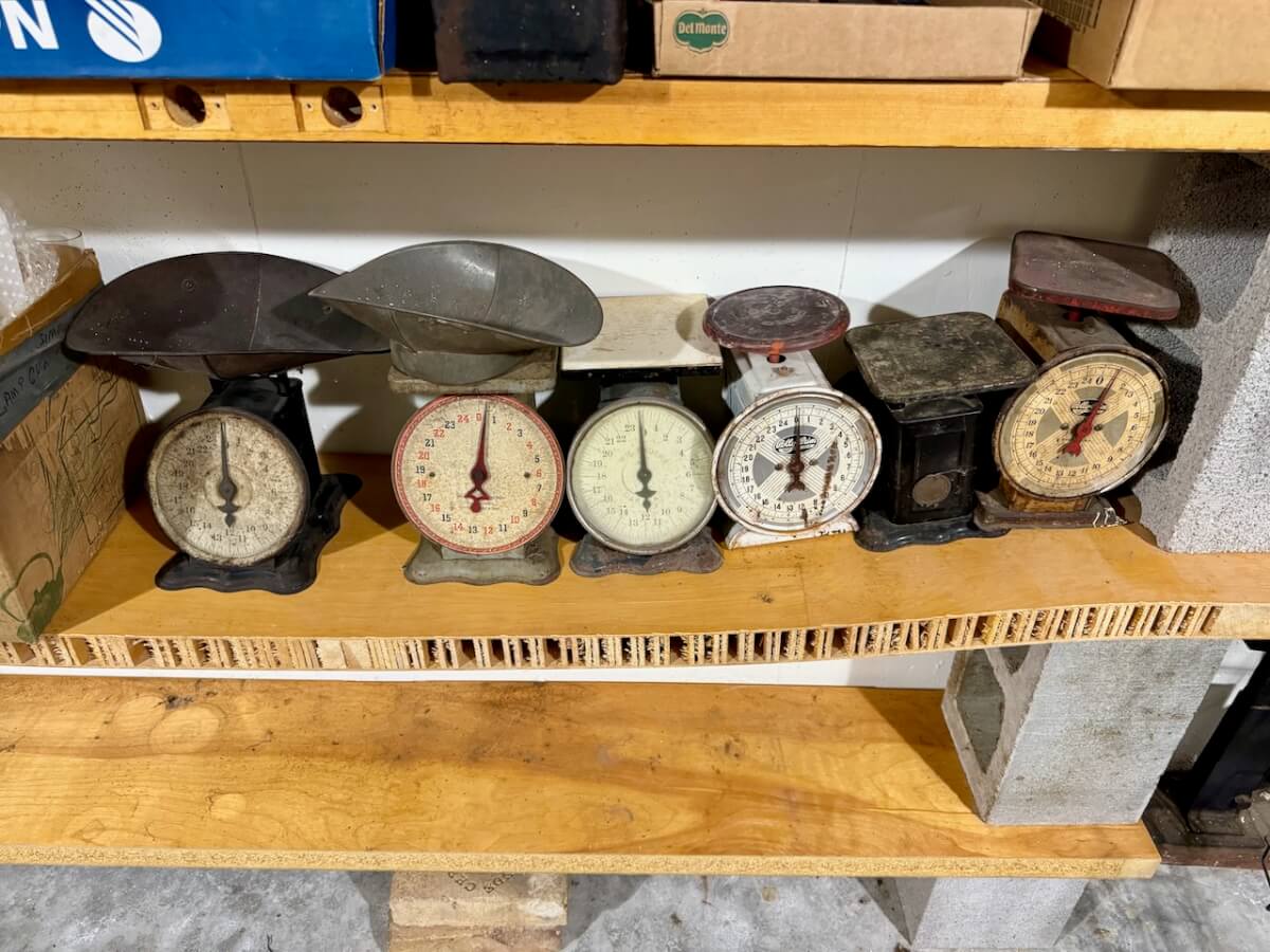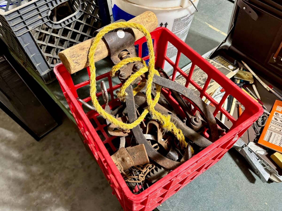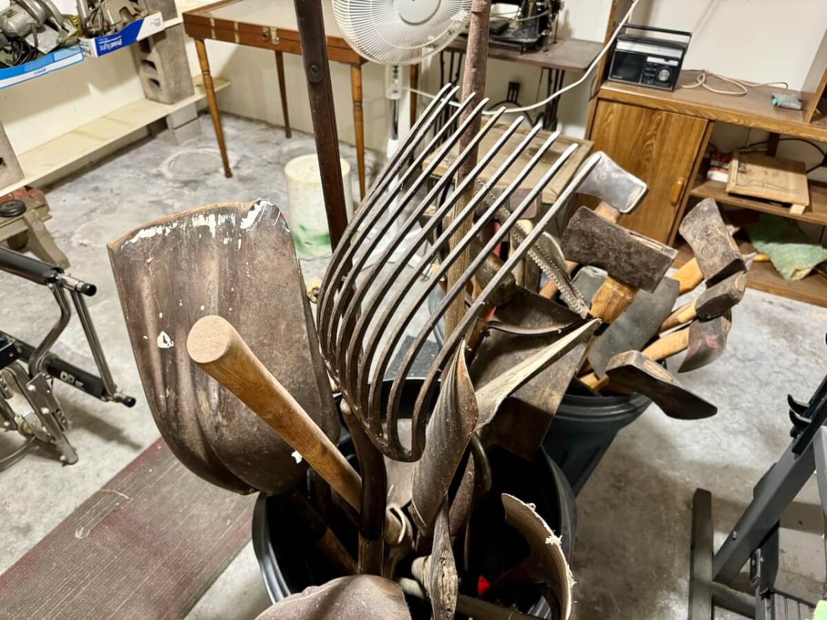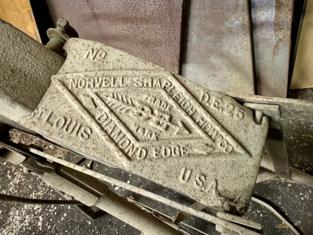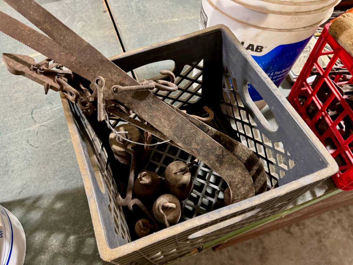 Miscellaneous Tools: Shapleigh scissors – Stanley saw set – Oak Leaf trowel – Winchester potato fork – Keen Kutter shears – Keen Kutter rat trap – Shapleigh rat trap – Stanley scraper – Keen Kutter T bevel – Keen Kutter ruler – Bay State pliers – 2 Keen Kutter grinders – Oak Leaf grinder – Keen Kutter square shovel – Keen Kutter pick – Keen Kutter scythe – Keen Kutter scoop – Keen Kutter weed whip – OVB ax – Winchester double head ax – Keen Kutter sharp shooter – Simmons, AT&SF, Keen Kutter, Winchester shovels & sharp shooters – Keen Kutter hand tools (trimmers, garden) – 2 Winchester 3 prong pitch forks – AT&SF silage fork & (others) – Old Jacks (Ford & others) – Ice tongs – Antique hay cutters – Keen Kutter garden plow – Keen Kutter shovel – Keen Kutter potato fork – Keen Kutter cutter – Diamond Edge cutter – Oak Leaf cutter – Simmons shovel – Simmons sharp shooter – A-S shovel – Oak Leaf sharp shooter – Keen Kutter 3 prong & 4 prong pitch forks – 5 Cattle yokes – 3 Cattle hobbles – 4 Keen Kutter post hole diggers – Excelsior scale – 2 Keen Kutter hoe – Keen Kutter leaf rake – 4 Keen Kutter garden rakes – Keen Kutter sledge hammer – 2 Keen Kutter scythe – Scale bars & weights – 2 Folding survey measuring sticks – 2 Survey measuring sticks – 4 Wooden survey tripods – 4 Richardson scale weights – American scale weight – 3 Diamond Edge hoe -Diamond Edge rake – Acme corn planter – Wooden tree trimmer – 6 Bottle jacks (American, Simplex, Vulcan)