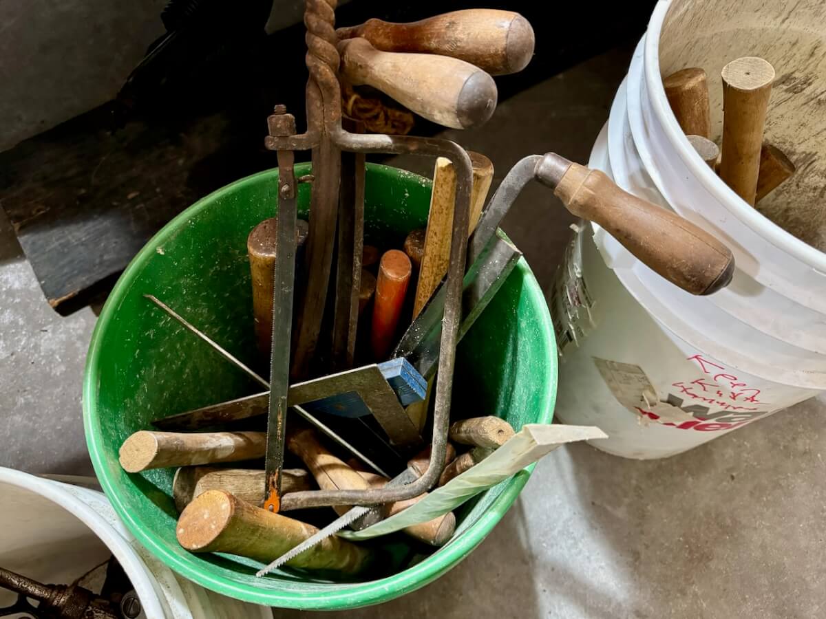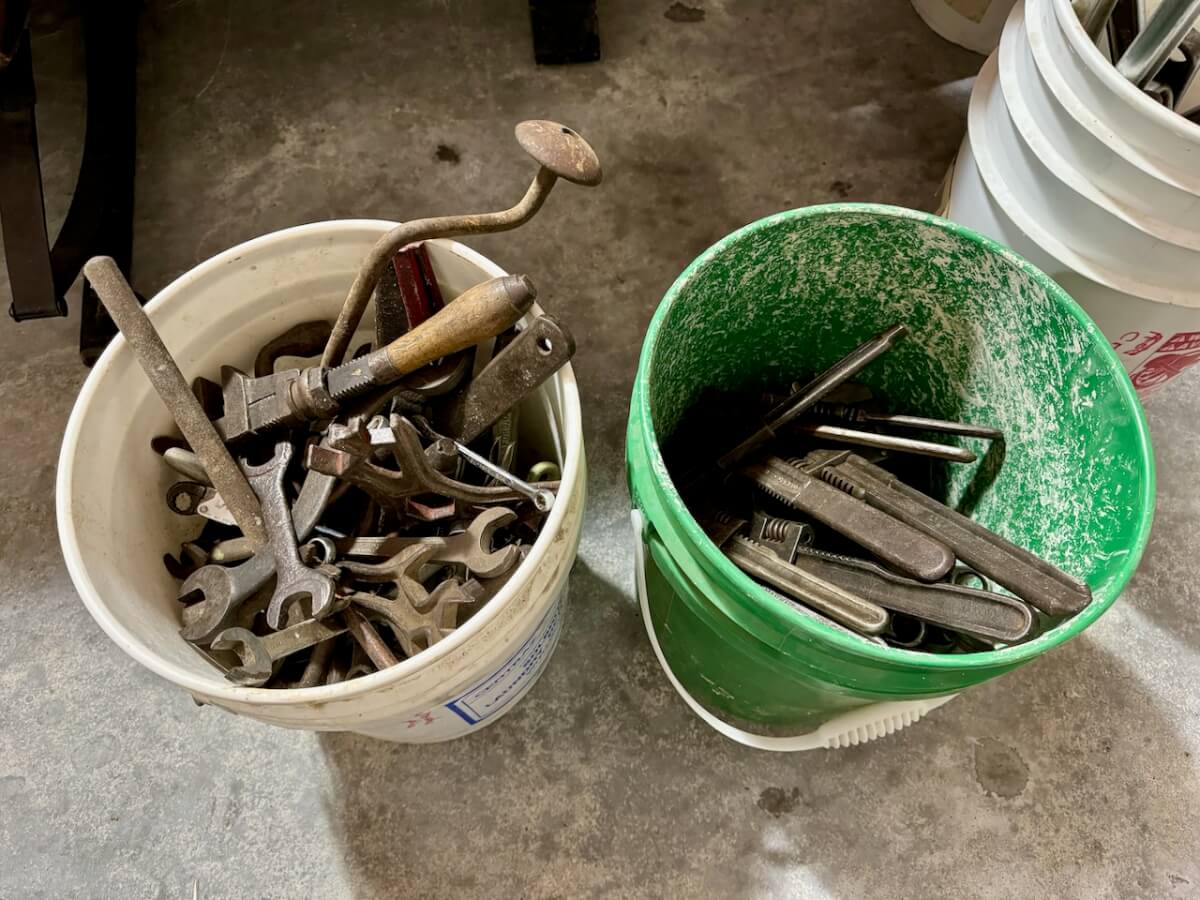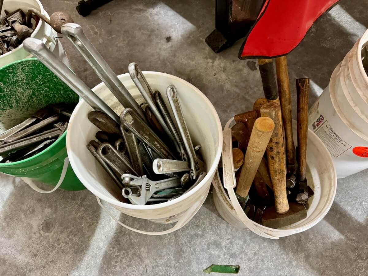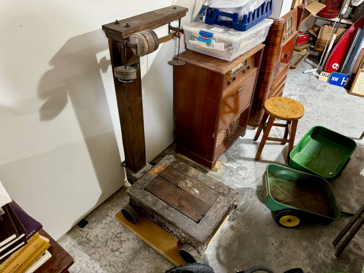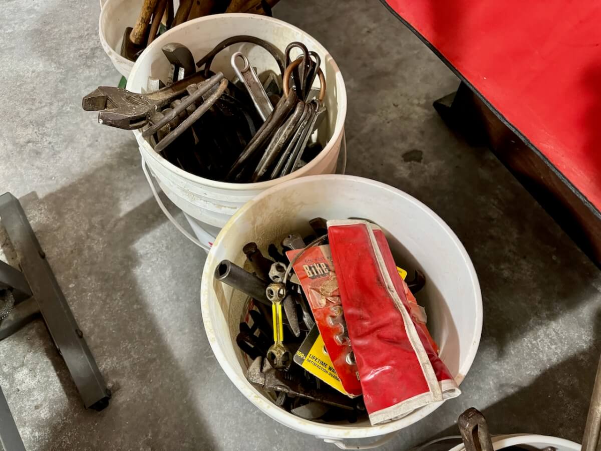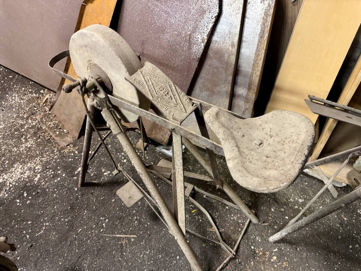 Miscellaneous Tools: Shapleigh scissors – Stanley saw set – Oak Leaf trowel – Winchester potato fork – Keen Kutter shears – Keen Kutter rat trap – Shapleigh rat trap – Stanley scraper – Keen Kutter T bevel – Keen Kutter ruler – Bay State pliers – 2 Keen Kutter grinders – Oak Leaf grinder – Keen Kutter square shovel – Keen Kutter pick – Keen Kutter scythe – Keen Kutter scoop – Keen Kutter weed whip – OVB ax – Winchester double head ax – Keen Kutter sharp shooter – Simmons, AT&SF, Keen Kutter, Winchester shovels & sharp shooters – Keen Kutter hand tools (trimmers, garden) – 2 Winchester 3 prong pitch forks – AT&SF silage fork & (others) – Old Jacks (Ford & others) – Ice tongs – Antique hay cutters – Keen Kutter garden plow – Keen Kutter shovel – Keen Kutter potato fork – Keen Kutter cutter – Diamond Edge cutter – Oak Leaf cutter – Simmons shovel – Simmons sharp shooter – A-S shovel – Oak Leaf sharp shooter – Keen Kutter 3 prong & 4 prong pitch forks – 5 Cattle yokes – 3 Cattle hobbles – 4 Keen Kutter post hole diggers – Excelsior scale – 2 Keen Kutter hoe – Keen Kutter leaf rake – 4 Keen Kutter garden rakes – Keen Kutter sledge hammer – 2 Keen Kutter scythe – Scale bars & weights – 2 Folding survey measuring sticks – 2 Survey measuring sticks – 4 Wooden survey tripods – 4 Richardson scale weights – American scale weight – 3 Diamond Edge hoe -Diamond Edge rake – Acme corn planter – Wooden tree trimmer – 6 Bottle jacks (American, Simplex, Vulcan)
