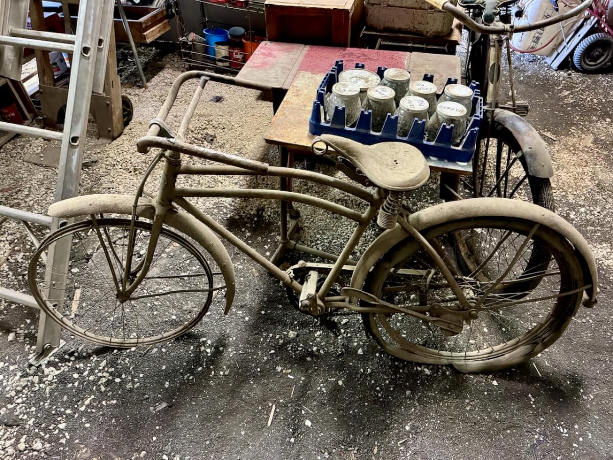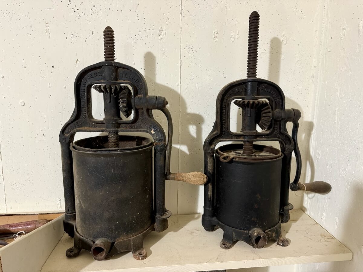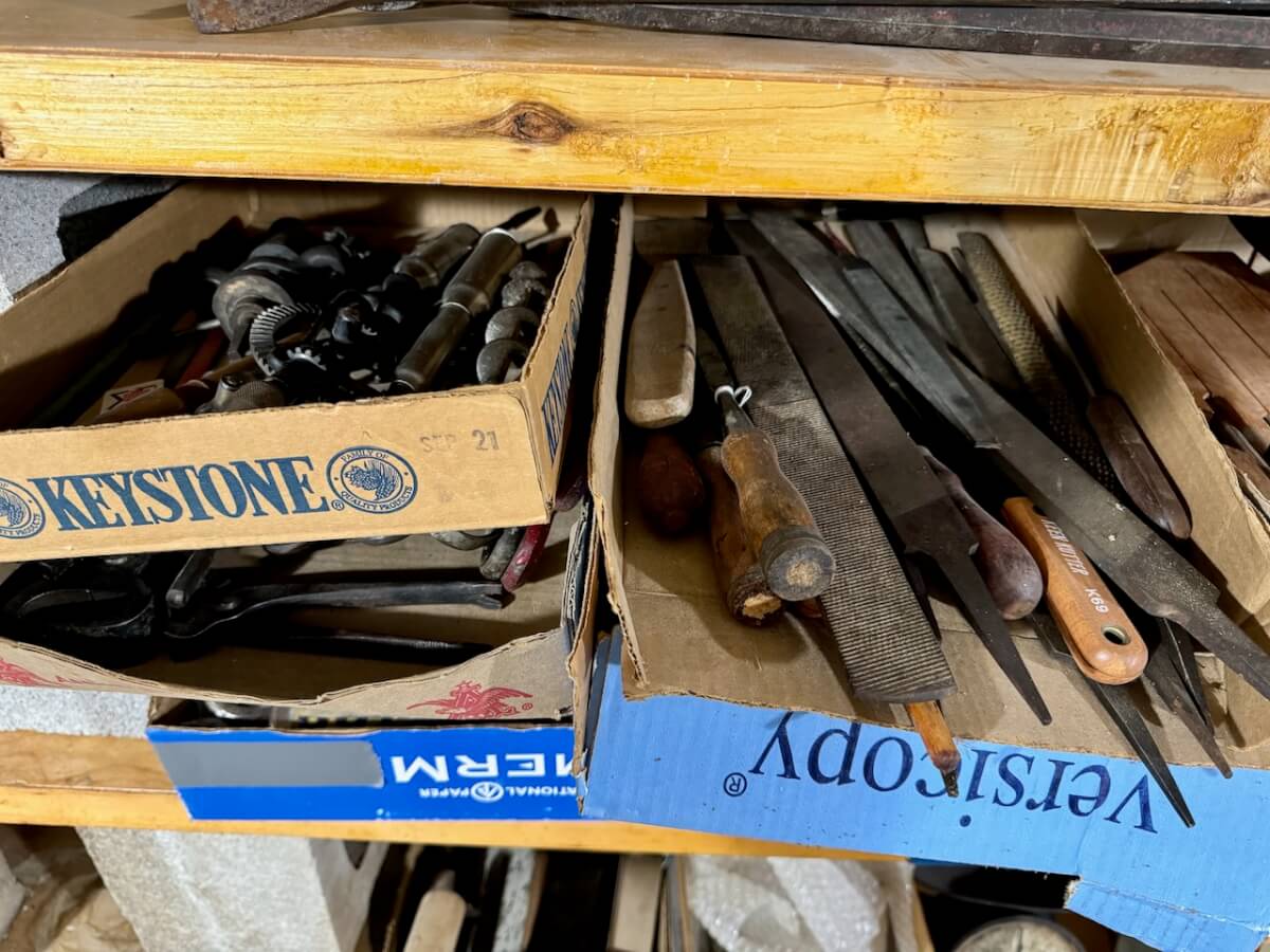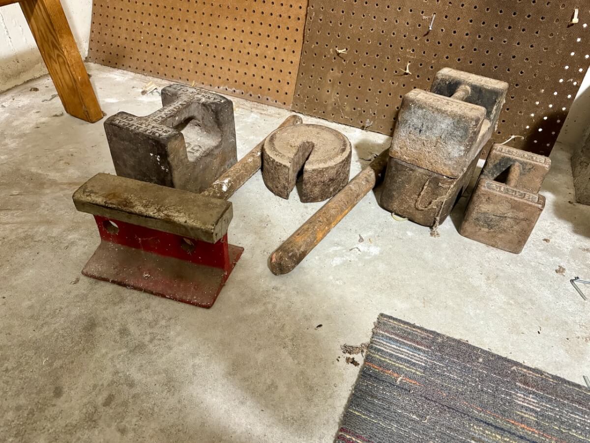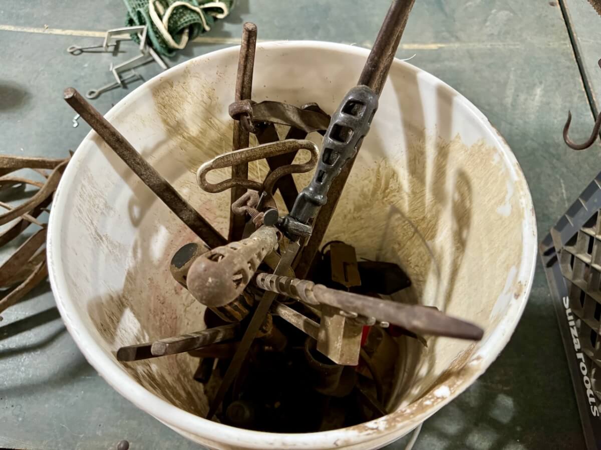Miscellaneous Tools: Shapleigh scissors – Stanley saw set – Oak Leaf trowel – Winchester potato fork – Keen Kutter shears – Keen Kutter rat trap – Shapleigh rat trap – Stanley scraper – Keen Kutter T bevel – Keen Kutter ruler – Bay State pliers – 2 Keen Kutter grinders – Oak Leaf grinder – Keen Kutter square shovel – Keen Kutter pick – Keen Kutter scythe – Keen Kutter scoop – Keen Kutter weed whip – OVB ax – Winchester double head ax – Keen Kutter sharp shooter – Simmons, AT&SF, Keen Kutter, Winchester shovels & sharp shooters – Keen Kutter hand tools (trimmers, garden) – 2 Winchester 3 prong pitch forks – AT&SF silage fork & (others) – Old Jacks (Ford & others) – Ice tongs – Antique hay cutters – Keen Kutter garden plow – Keen Kutter shovel – Keen Kutter potato fork – Keen Kutter cutter – Diamond Edge cutter – Oak Leaf cutter – Simmons shovel – Simmons sharp shooter – A-S shovel – Oak Leaf sharp shooter – Keen Kutter 3 prong & 4 prong pitch forks – 5 Cattle yokes – 3 Cattle hobbles – 4 Keen Kutter post hole diggers – Excelsior scale – 2 Keen Kutter hoe – Keen Kutter leaf rake – 4 Keen Kutter garden rakes – Keen Kutter sledge hammer – 2 Keen Kutter scythe – Scale bars & weights – 2 Folding survey measuring sticks – 2 Survey measuring sticks – 4 Wooden survey tripods – 4 Richardson scale weights – American scale weight – 3 Diamond Edge hoe -Diamond Edge rake – Acme corn planter – Wooden tree trimmer – 6 Bottle jacks (American, Simplex, Vulcan)