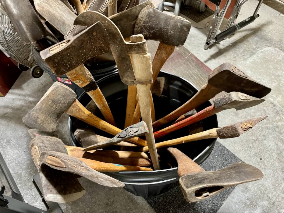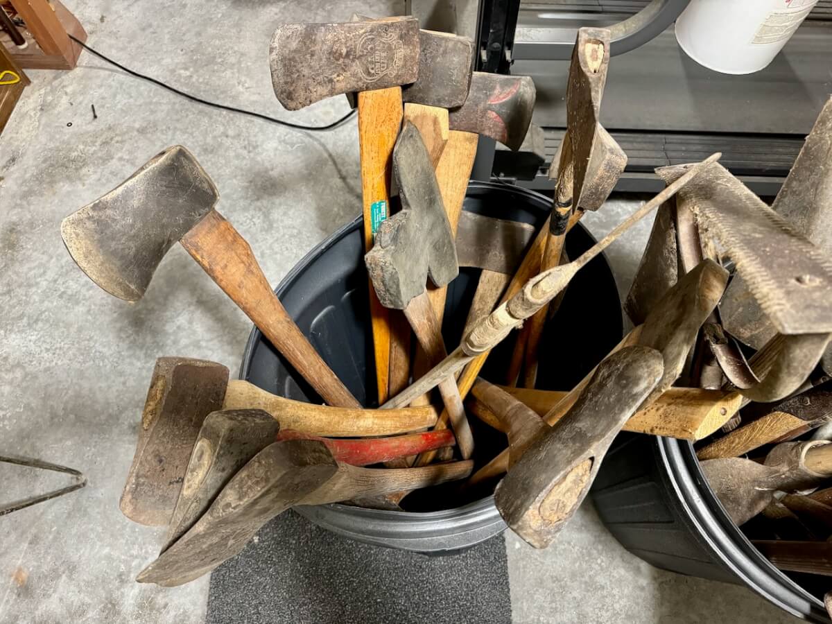 Axes & Pics: 2 Shapleigh – 7 Keen Kutter – 6 Diamond Edge -1 Stanley – 3 Keen Kutter Axe Heads – 2 Simmons – Simmons Double Head – AT&SF handle – Simmons Broad Ax