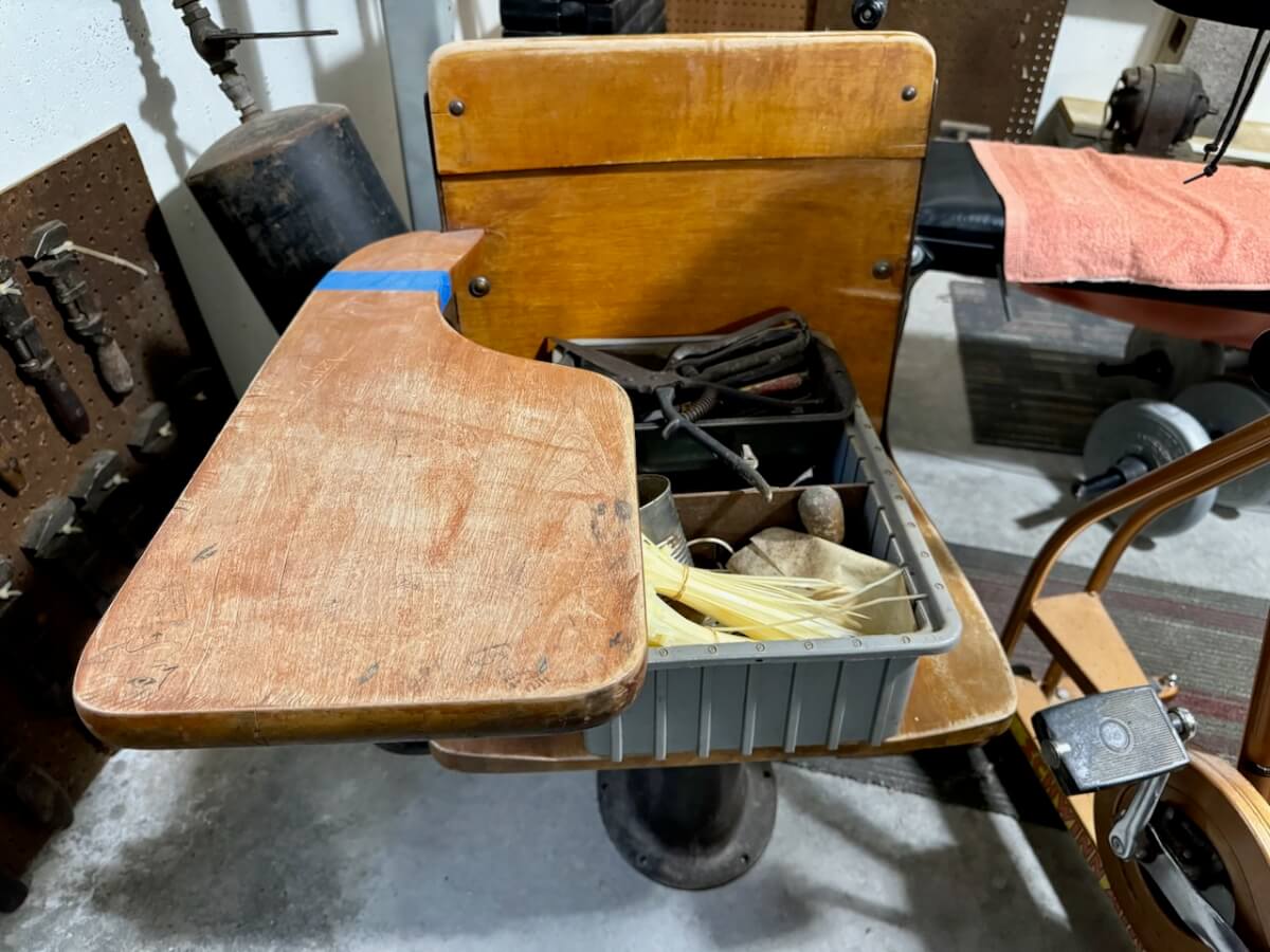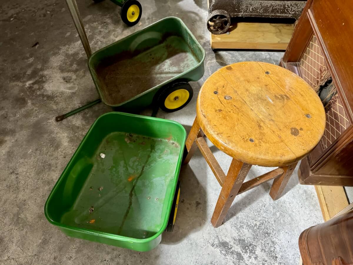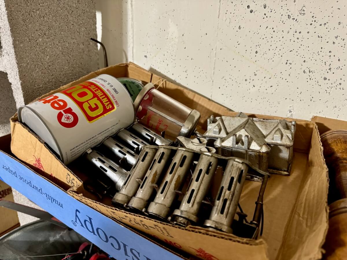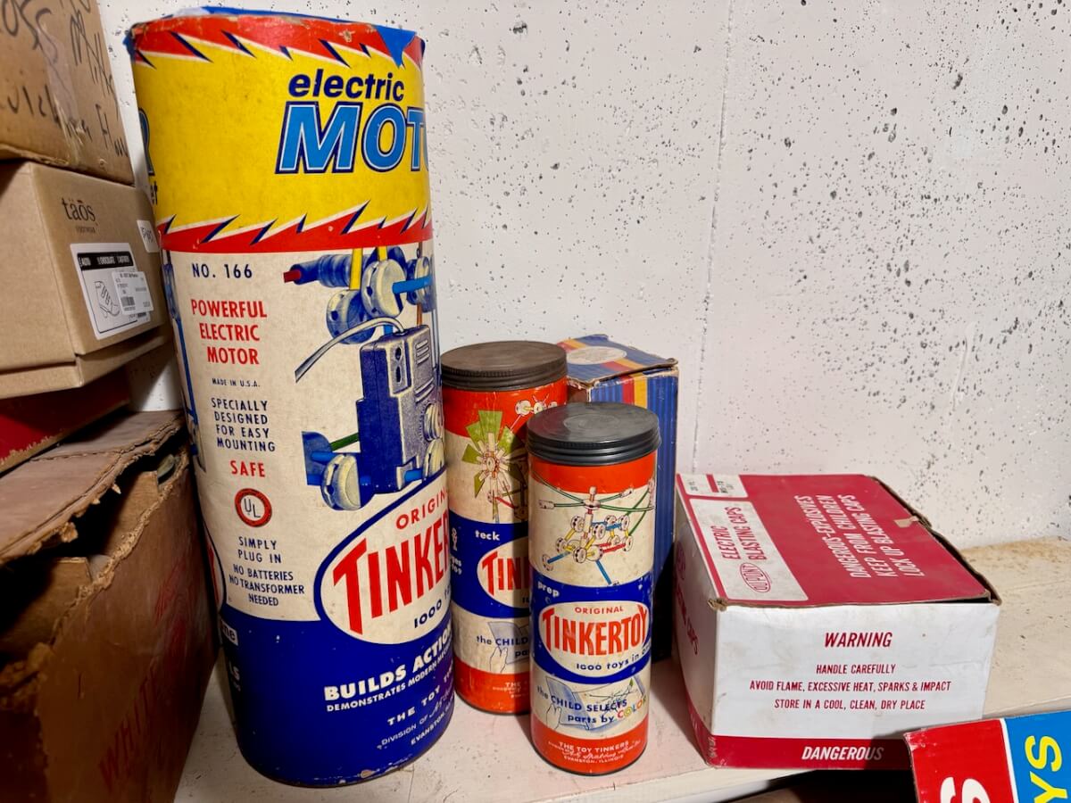 3 Tinker Toy Sets – Western Hand Trap – Small Display Case – Box of Western Clay Pigeons – 10 Tire Ash Trays (Goodrich-Hercules-Seiberling-Goodyear) – Keen Kutter Cardboard Box – Shapleigh Cardboard Box – Schwinn Cardboard Box – Sears Craftsman Clock – Dr Pepper Clock (damaged) – Shapleigh Racer Wagon – Pocket Fisherman – Gyroscope – Puzzle Ring – Slinky – 4 Chicken Feeders – Old Wood Store Displays – Skelly Patch – Maps (Conoco, Vickers) – Denny Klepper Oil Co Ashtray – Coop Coffee Can – John Deere Model 20 Toy Tractor (NIB) – Pedal Tractor Wheels – 2 Bede Aircraft BD-5D Airplane Models – 4 Toy Tractors – Print Blocks & Stamps – Lamp Chimneys – Super Air Hose & Pressures – Film Strip Projector – Shapleigh Run Easy Wash Machine Wringer – Shapleigh Torch – Shapleigh Tackle Box – Shapleigh Waffle Iron – 2 Bostrom Survey Kits – Simmons Vacuum Sweeper – 3 Whitewater Bank Metal Boxes – Hesston HS Football Canvas Laundry Bag – Gold Medal USA Puzzle