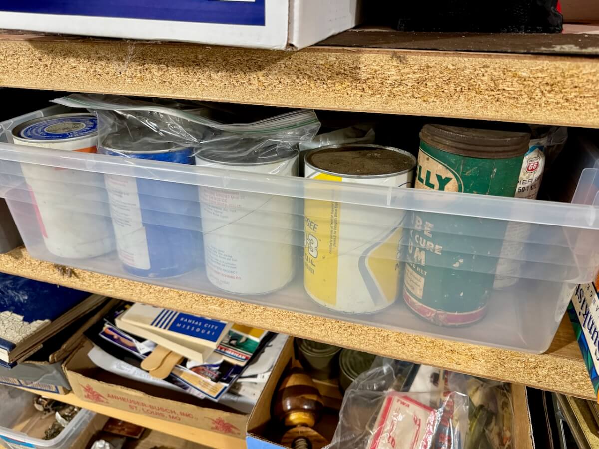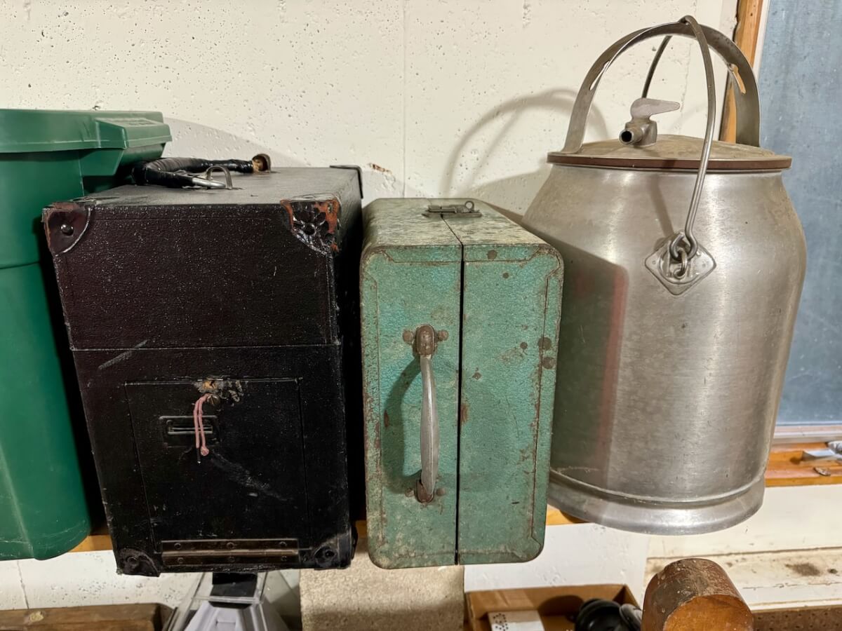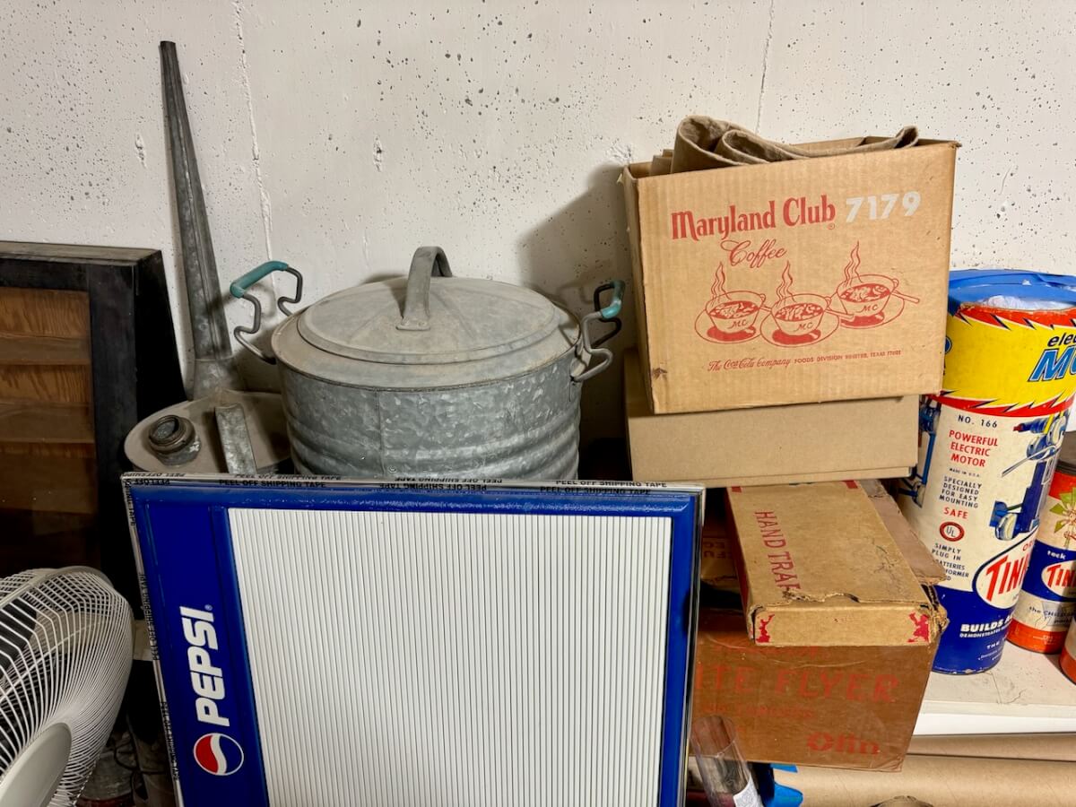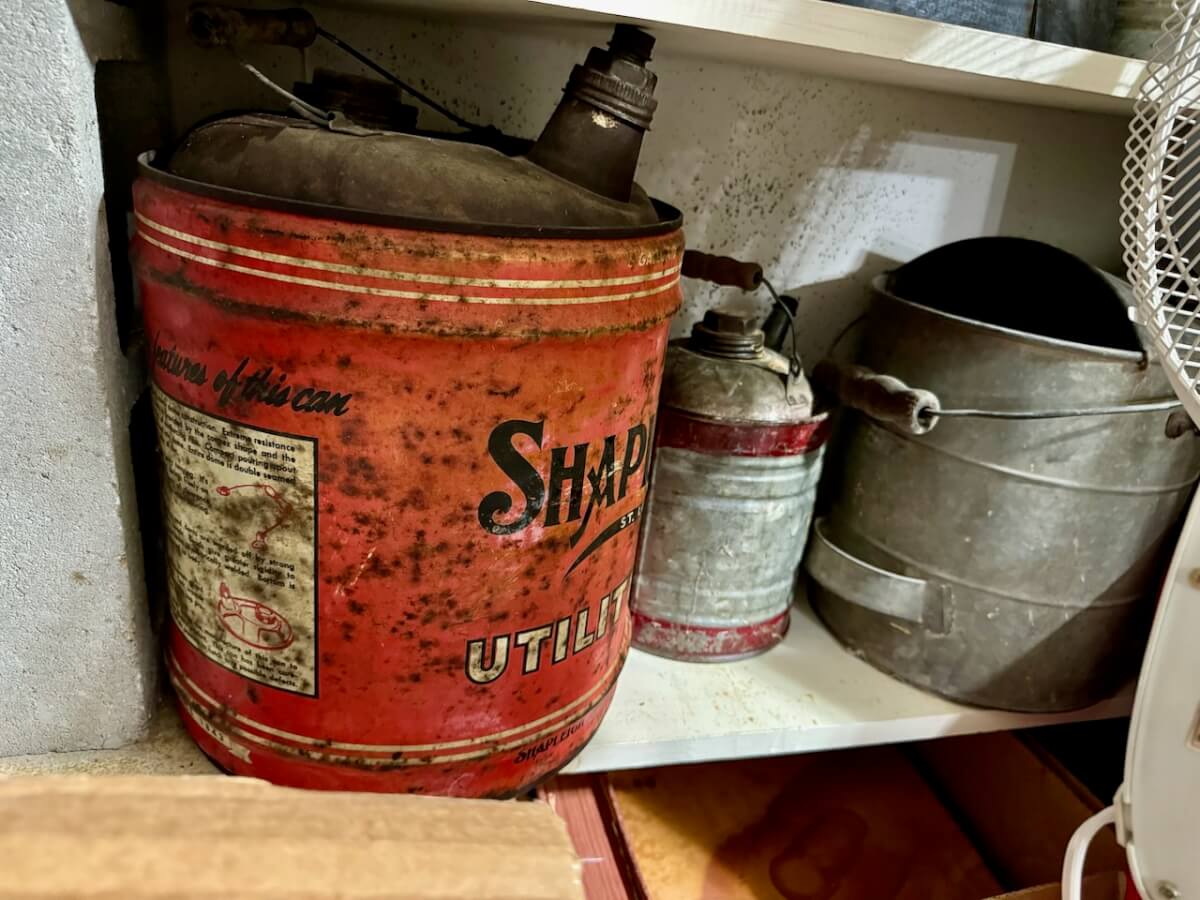 Cans: Shapleigh Oil Can – AT&SF Oil Can – Wyatt Oil Can – Simmons Oil Can – Shapleigh Enamelware Chamber Pot – Bluegrass Water Cooler