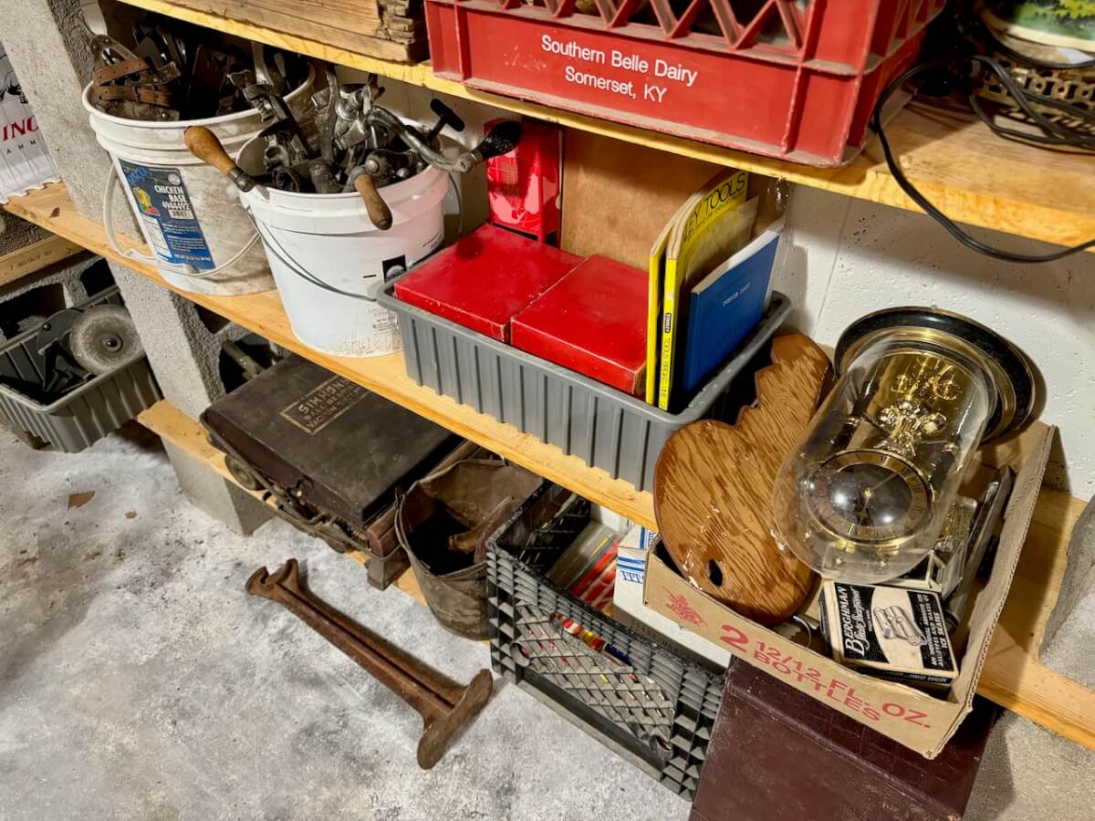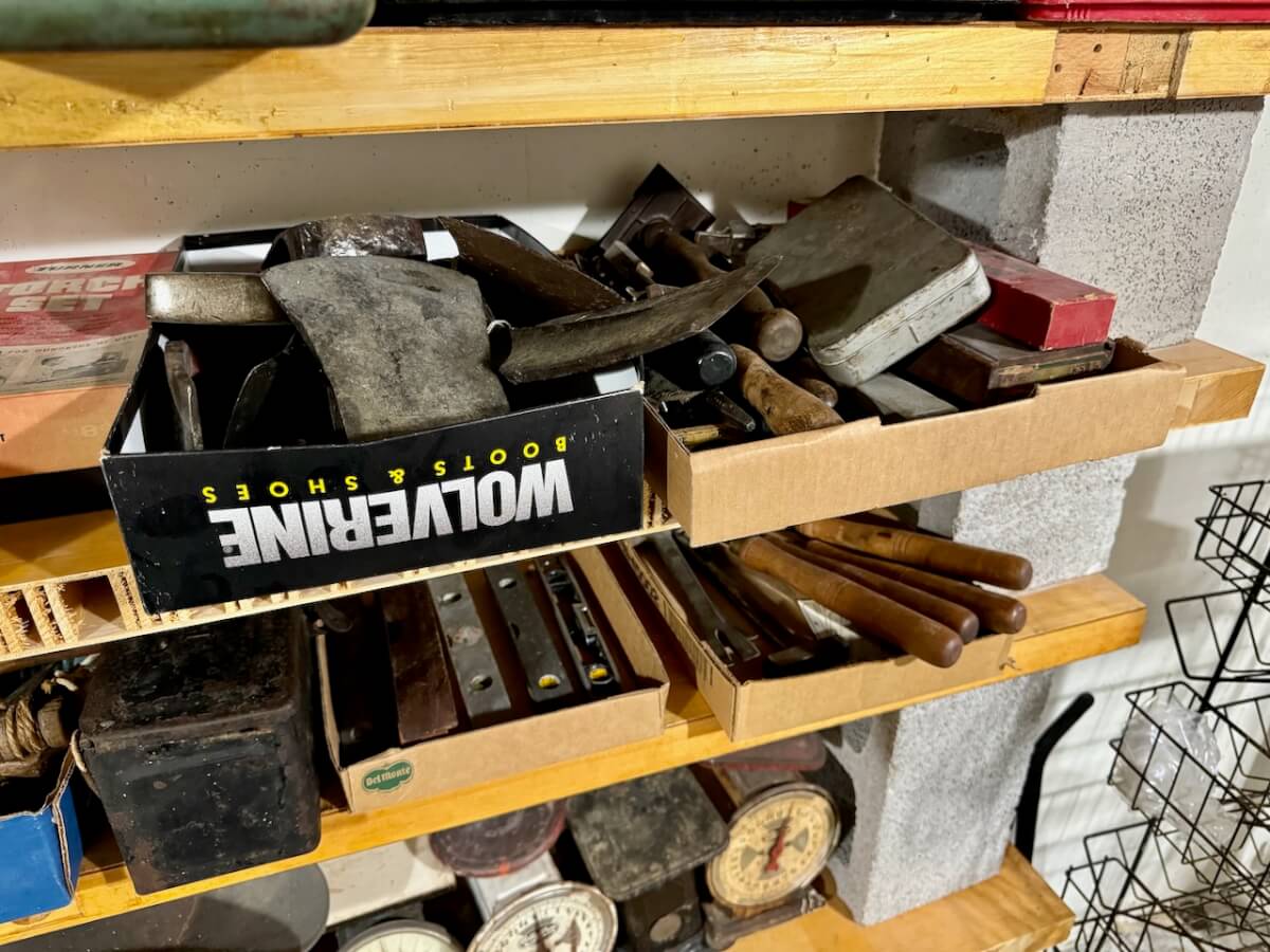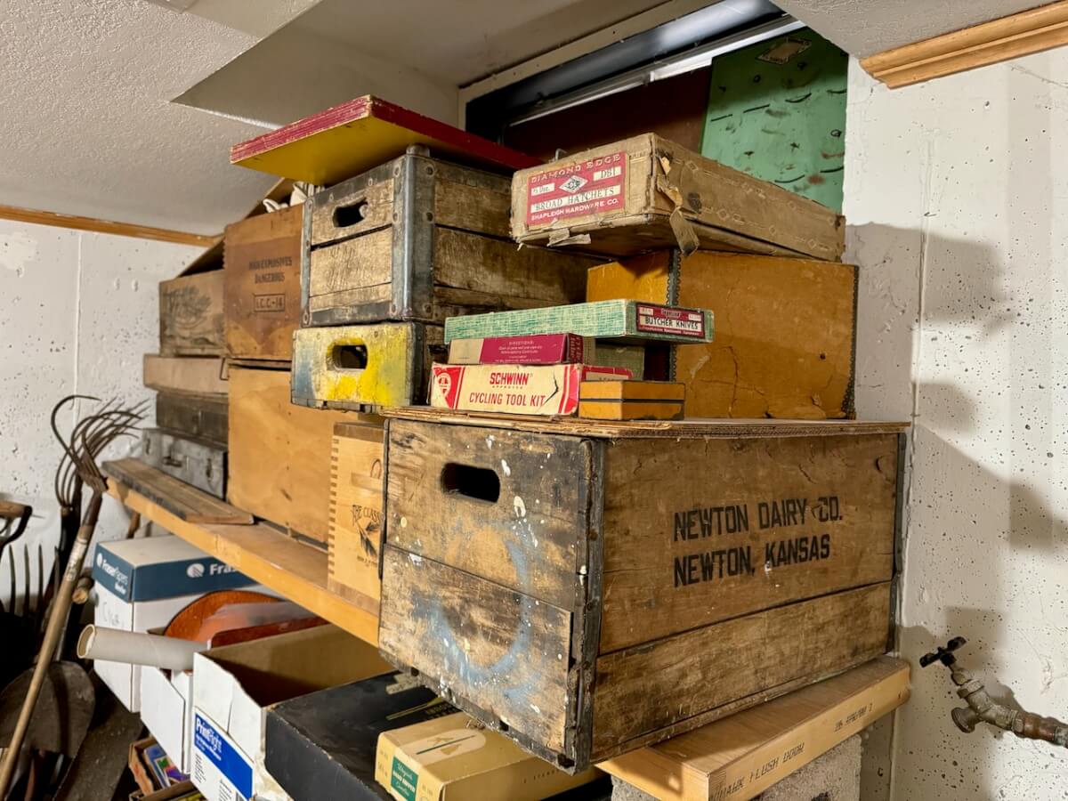 Wooden Boxes: Winchester Box – Keen Kutter Box – 2 Shapleigh Boxes – Dupont Explosives Box – Pepsi Crate – Keen Kutter Tool Box – Newton Sunflower Hatchery Box – Newton Dairy Co Dover Sad Iron Box filled w/dated nails – 6 Cedar Boxes – Newton L Swartz Co Board – Bethel College Board – Shamrock Milk Crate – Holiday Assortment Wood Box