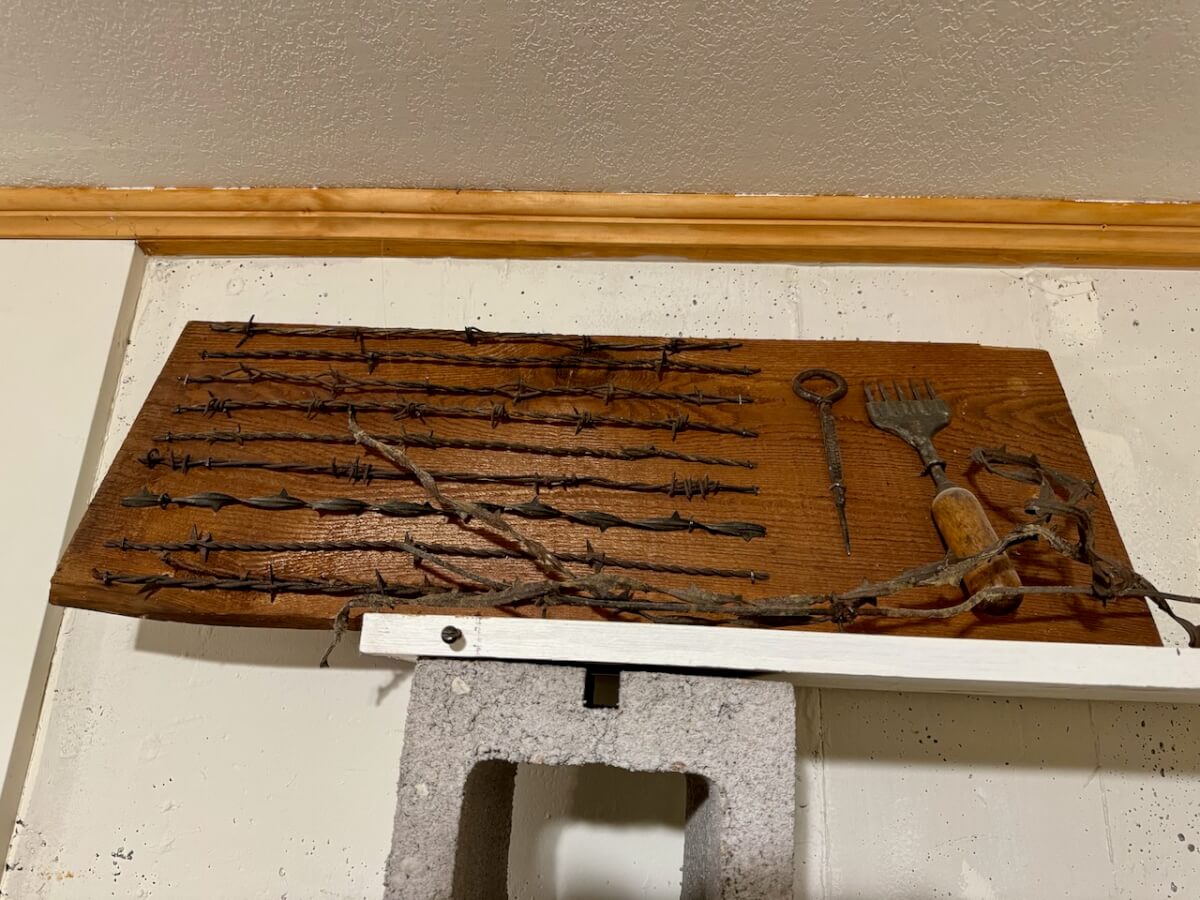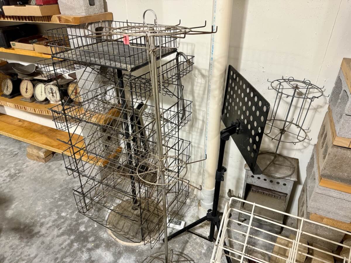 Miscellaneous: 3 Revolving racks – Wire display rack – Simmons stove/heater – Bowling pins – Music stand – Sonic drive-in tray – Rotating lamp – Walking sticks – Laminated USA map – Folger Coffee mirror – GE transmitter radio – Claremont Hotel spoon – Lassen Hotel spoon – Coco Cola bottle opener – Eldorado Texaco Patches