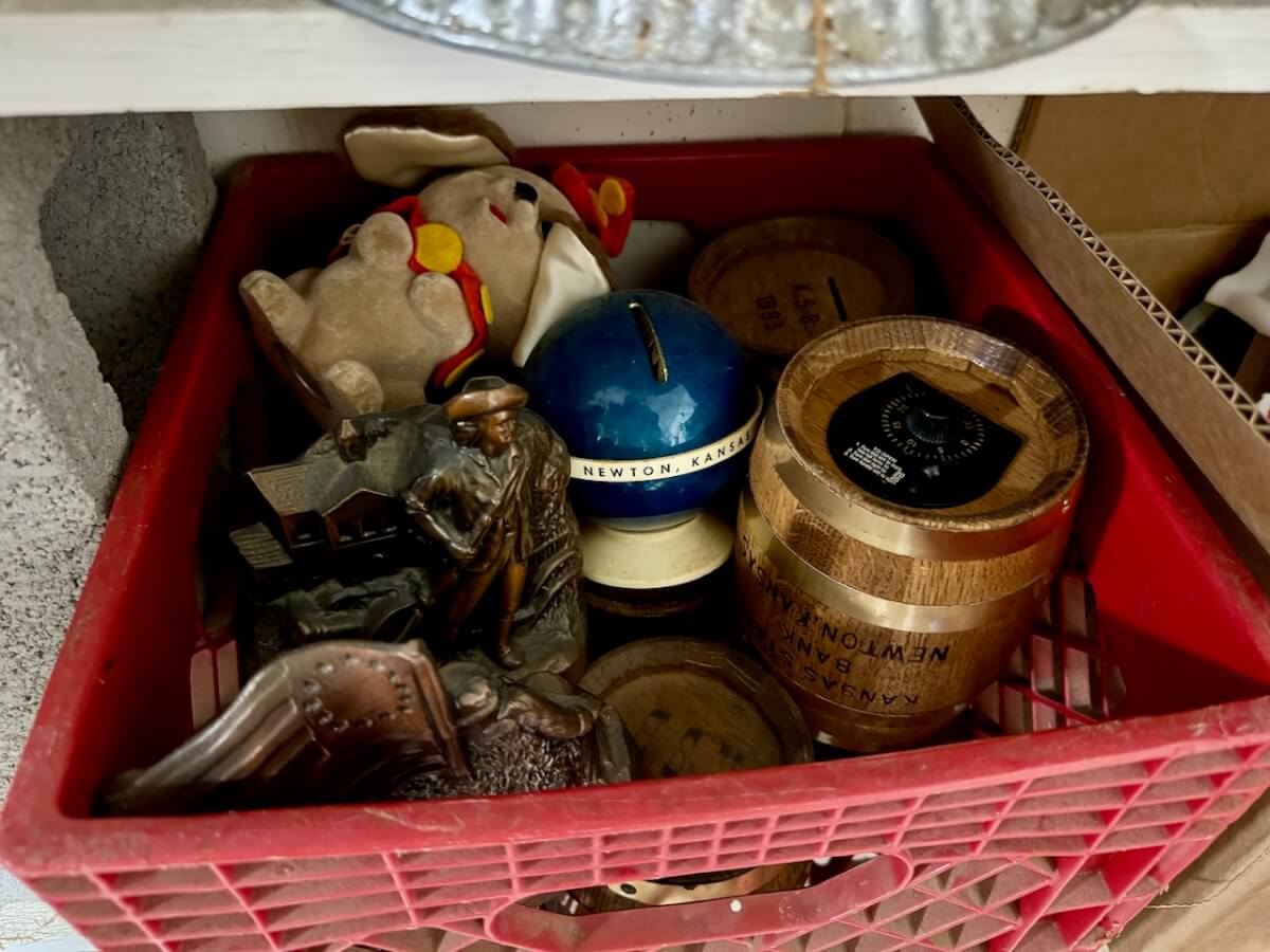 Banks: 29 Newton Banks (1st National, Midland, 1st Federal, Kansas State) – 3 Metal Barrel Coin Changers – 1 Bethel College Bank -1 Chapman State Bank – 1 Getty Bank – 1 Prosperity Bank