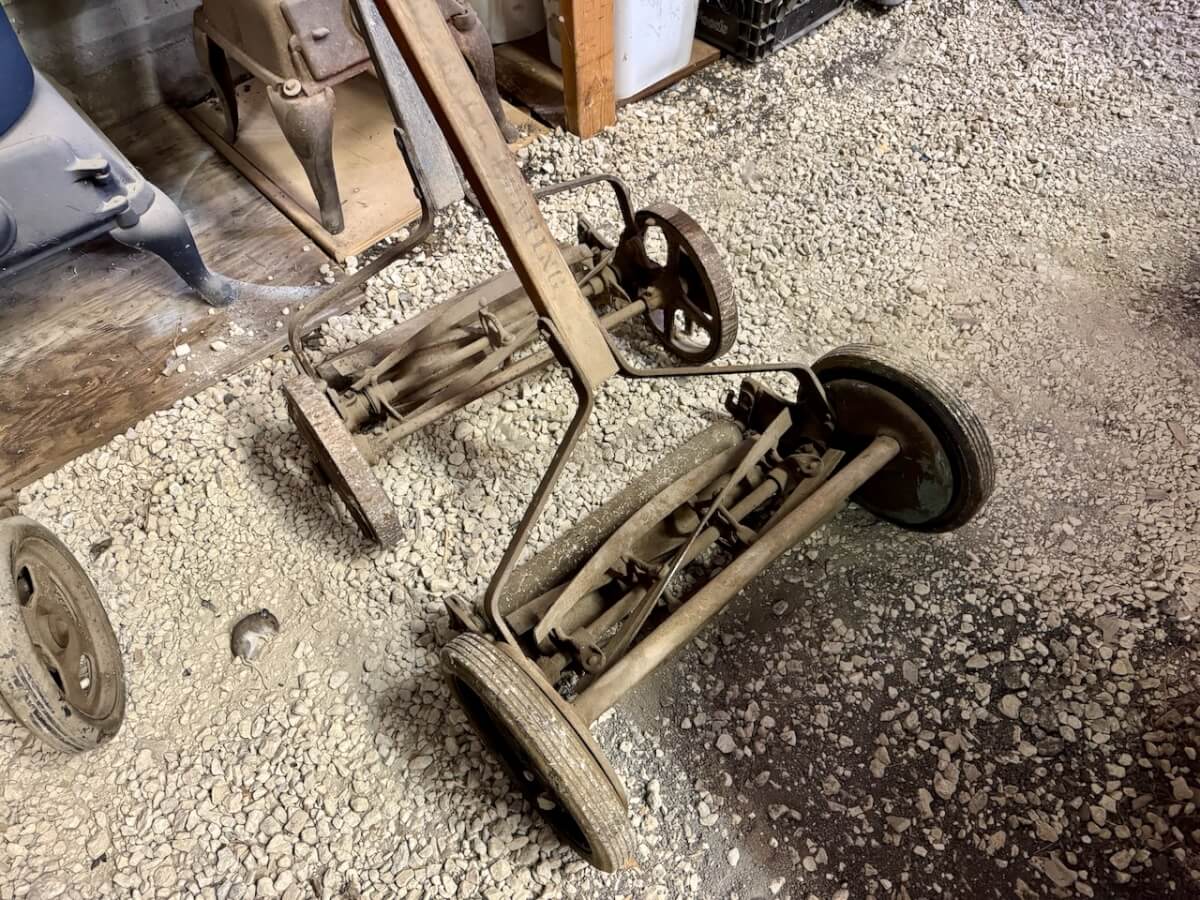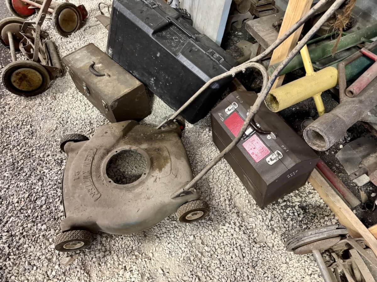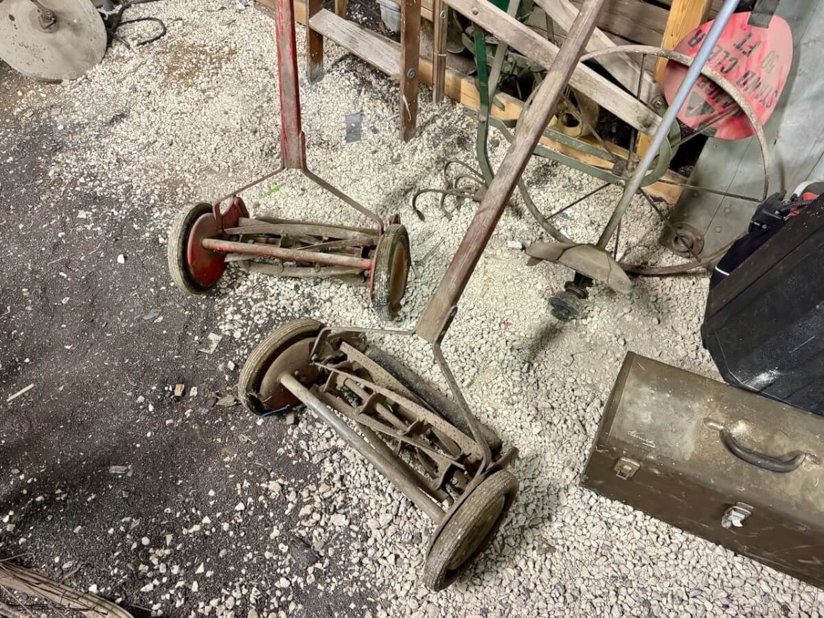 Mowers: 2 Keen Kutter reel mowers – 1 Shapleigh reel mower – 1 Diamond Edge reel mower – 1 Bluegrass reel mower – Keen Kutter mower deck