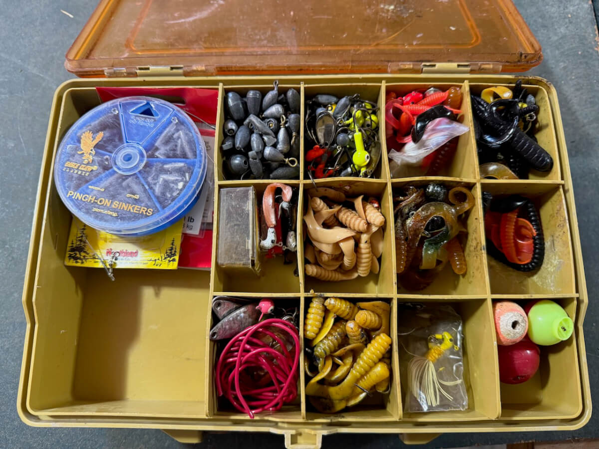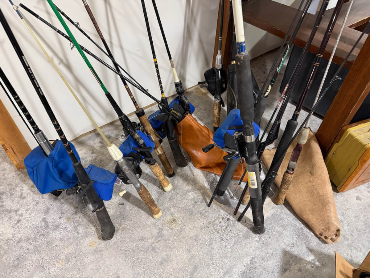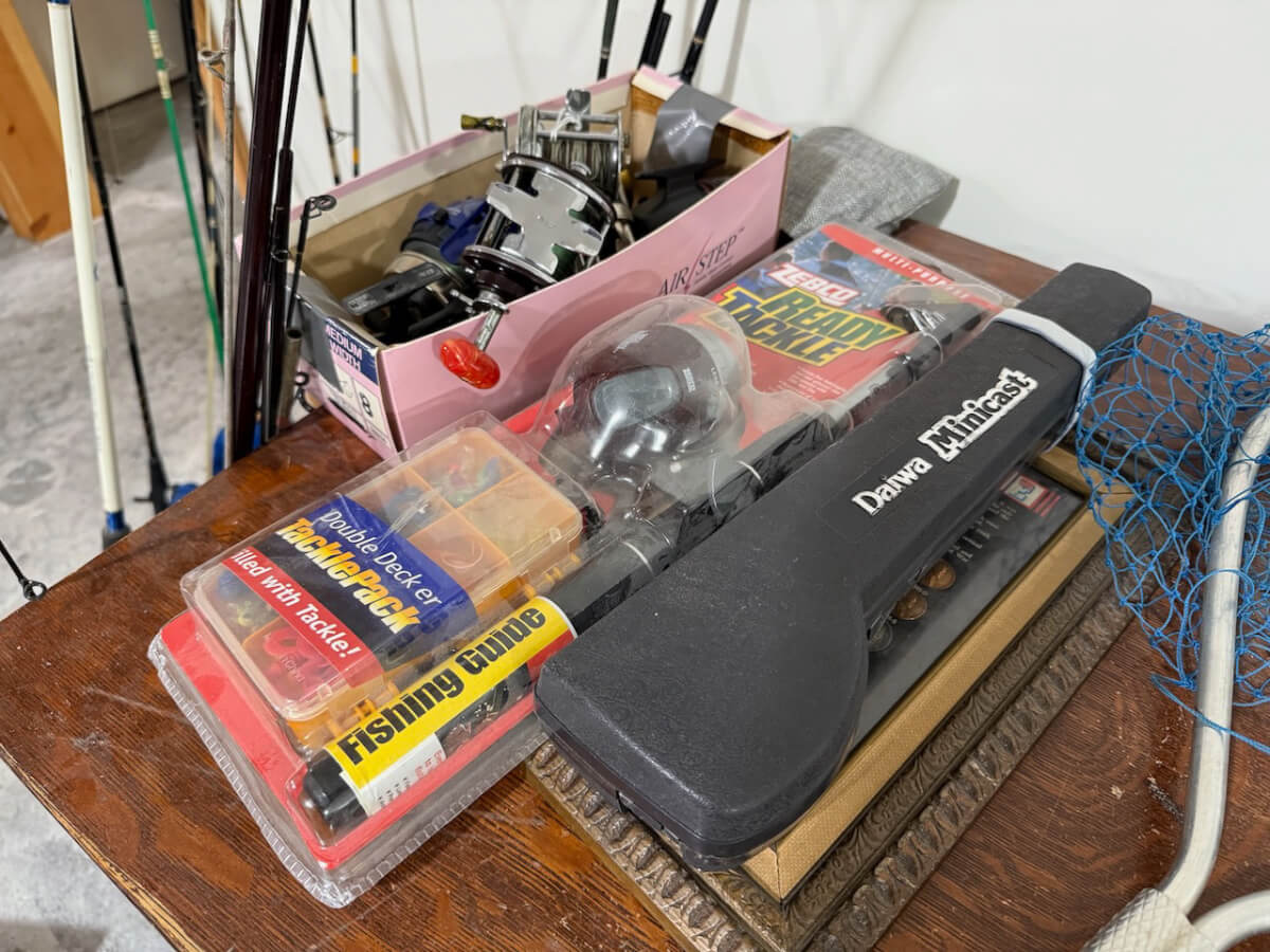 Fishing, Camping, Outdoor: Numerous Zebco Fishing Rods & Reels. Fishing Pole Cases. Tackle Boxes. Fishing Pole Stand. Fillet Board. Bait Casting Reels – William Penn. Shapleigh. Diawa. Simmons. Fishing Lures. Crank Bate. Spinners. Weights. Floats. Plastic Worms. Fish Finder. Propane Heaters. Camp Fire Toaster made by Newton HS Shop Class. Coleman Camping Stove. Coleman Battery Lantern. New Maglite Flashlight. Numerous Flashlights. Trius Trap Thrower. Backpack. Wooden Ammo Box. 2 Boat Seats. Archery Target. Fish Scales. Coleman Lantern. Discus. Dumbells. Croquette Set. Golf Ball Retriever Bag. Table Top Smoker/Grill. Minn Kota #65 Trolling Motor. Fishing Pole Holders. Two New Stadium Seats.