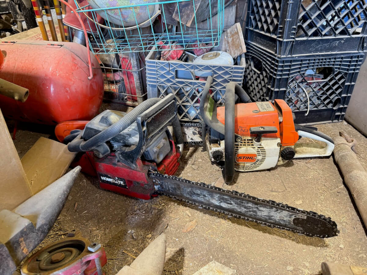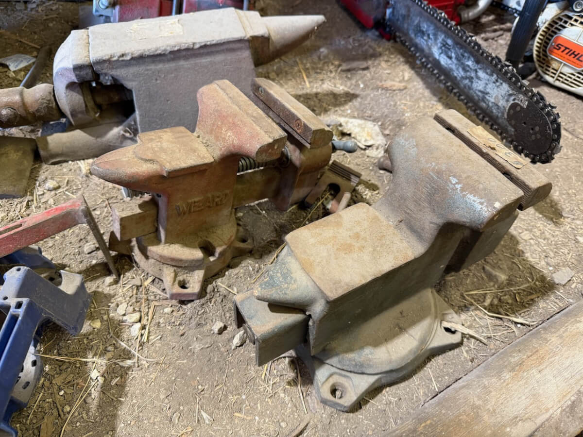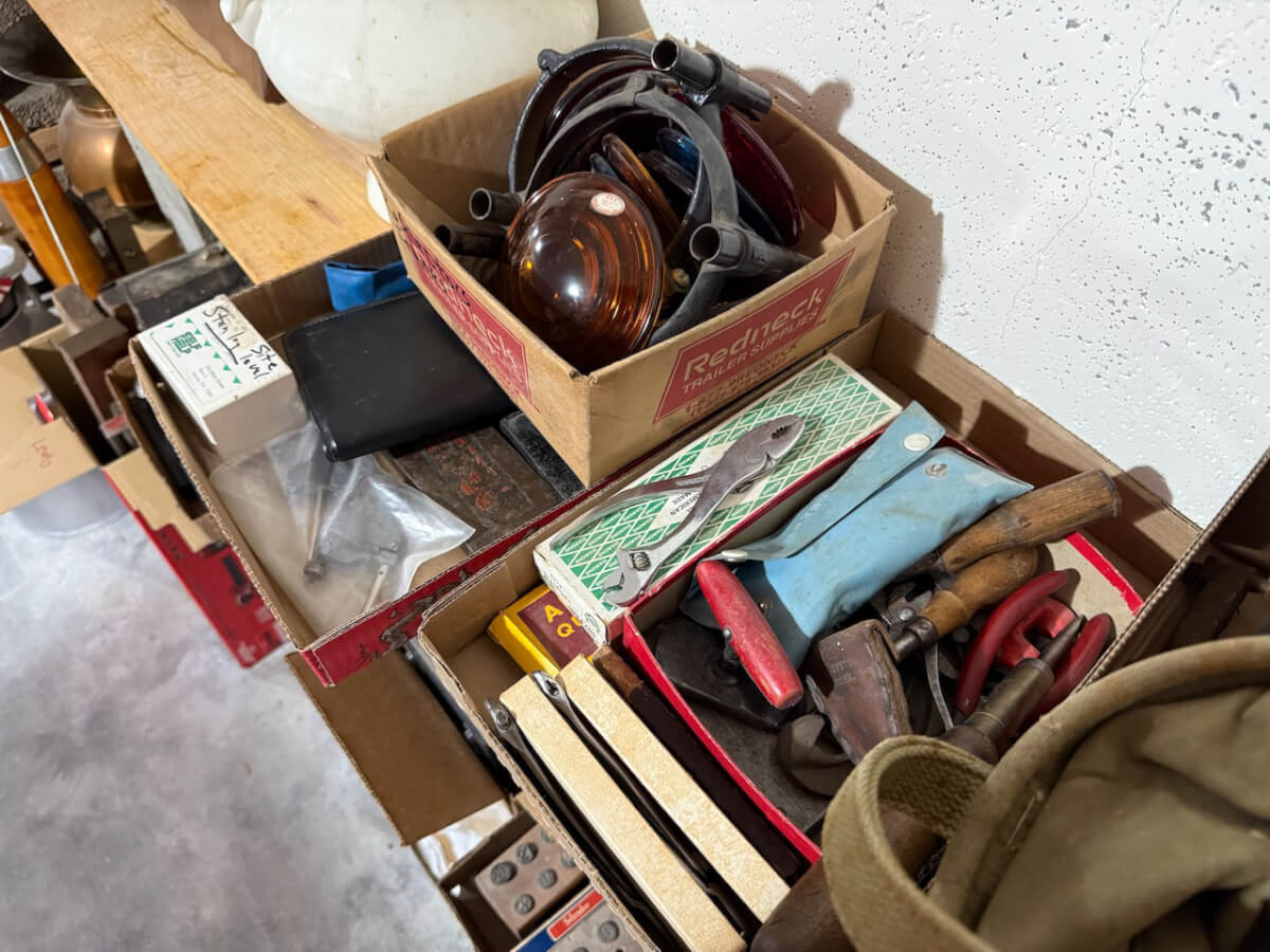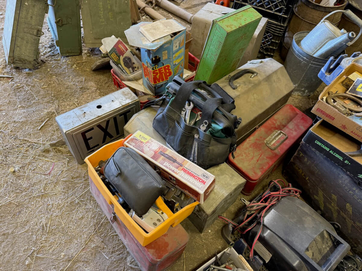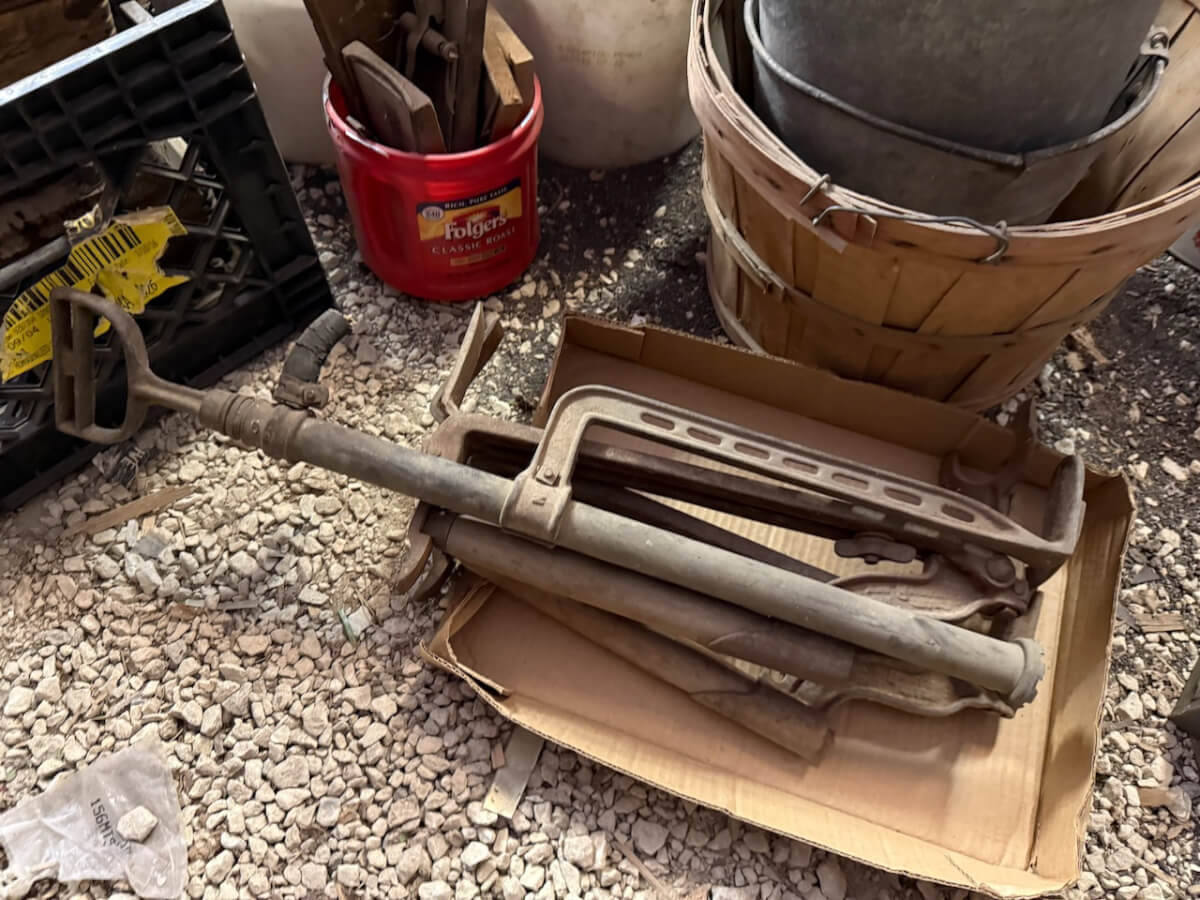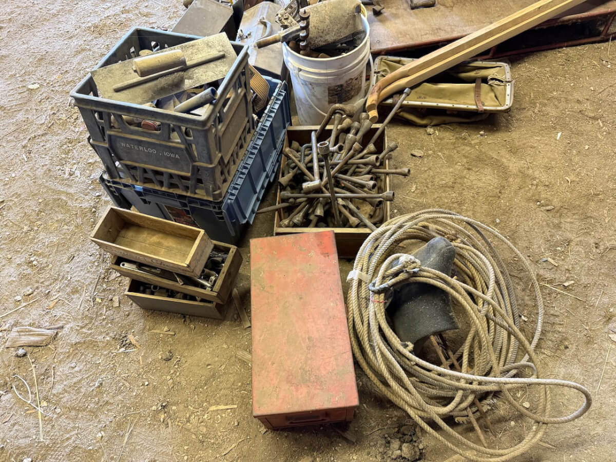 Tools & Miscellaneous: Small Planes. Plumb Bobs. Tap & Die. Sharpening Stones. Steering Wheel Knobs. Bicycle Bells. Blue Grass Catalogs. Square Nails. Sockets. Levels. Dated Nails. Surveyor Scope. Scale Weights. Hay Hook. Shapleigh Scythe Stone. Stanley Folding Rule. Leather Working Tools. Simmon, Stanley, Keen Kutter Tools. Advertising – Stanley. Shapleigh. Diamond Edge. 3 Wooden Nail Kegs. Numerous RR Hinges – ATSF. Hardware Organizer. Numerous Tool Boxes. Two Plastic Board Tool Holders. Gauges. Antique Air Pumps. Grinder. Old Water Pump. Wooden Tool Tray. Many Miscellaneous Tools. Pumps. Electric Fence Materials. Winches. Shelf & Wall Hangers. Router. Home Lite Chainsaw. Chainsaw Case. Stihl Chainsaw. Concrete Tools. Chainsaw Chains & Bars. Thunder Gun Power Washer. Jig Saw. Soldering Kit. Electric Heater. Paint Sprayer Kit. Collectible Jack. Toolbox Full of Sockets. Toolbox Full of Screwdrivers. Toolbox Full of Wrenches, Screwballs. Toolbox Full of Pliers, Vise Grips, Crescents. Box of Miscellaneous Tools. 3 Tool Belts w/Tools. Crate Full of Miscellaneous Tools. Toolbox Full of Hand Saws. Lots of Miscellaneous Wrenches & Sockets. Anvil