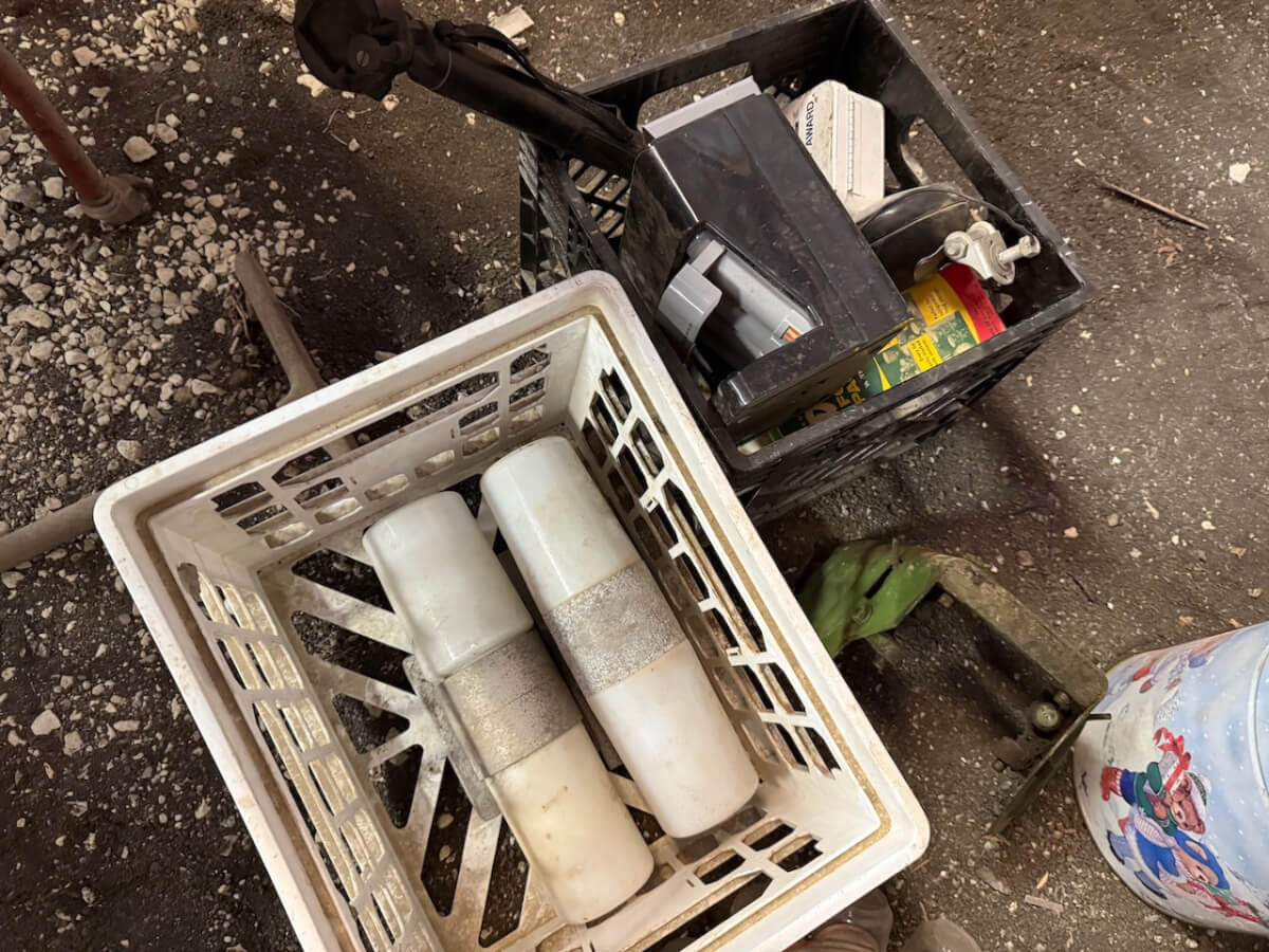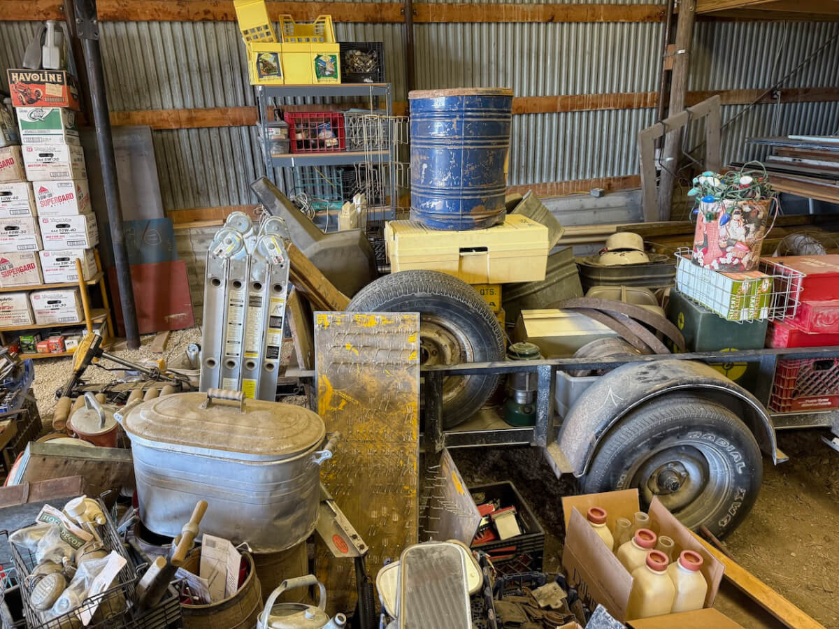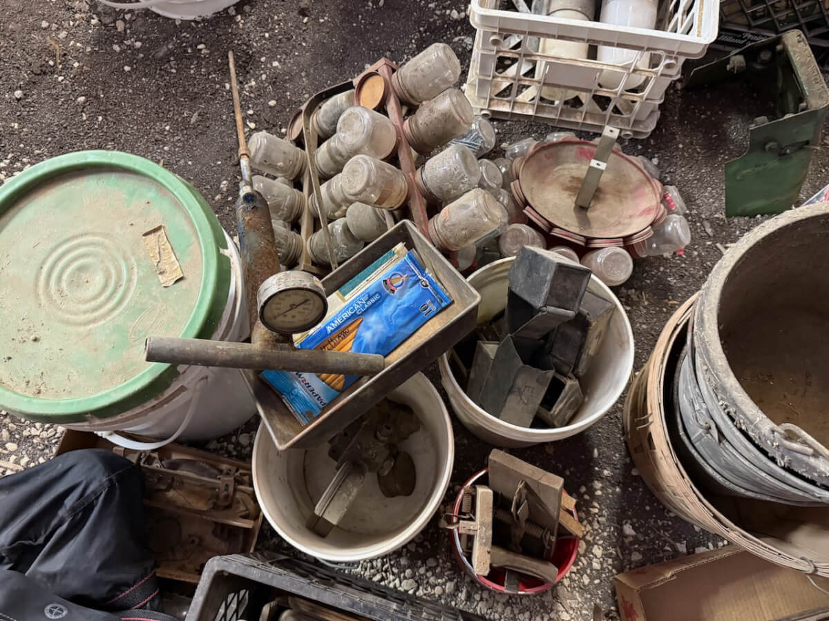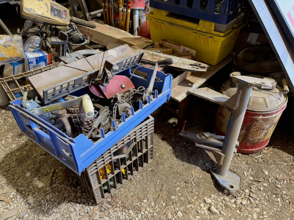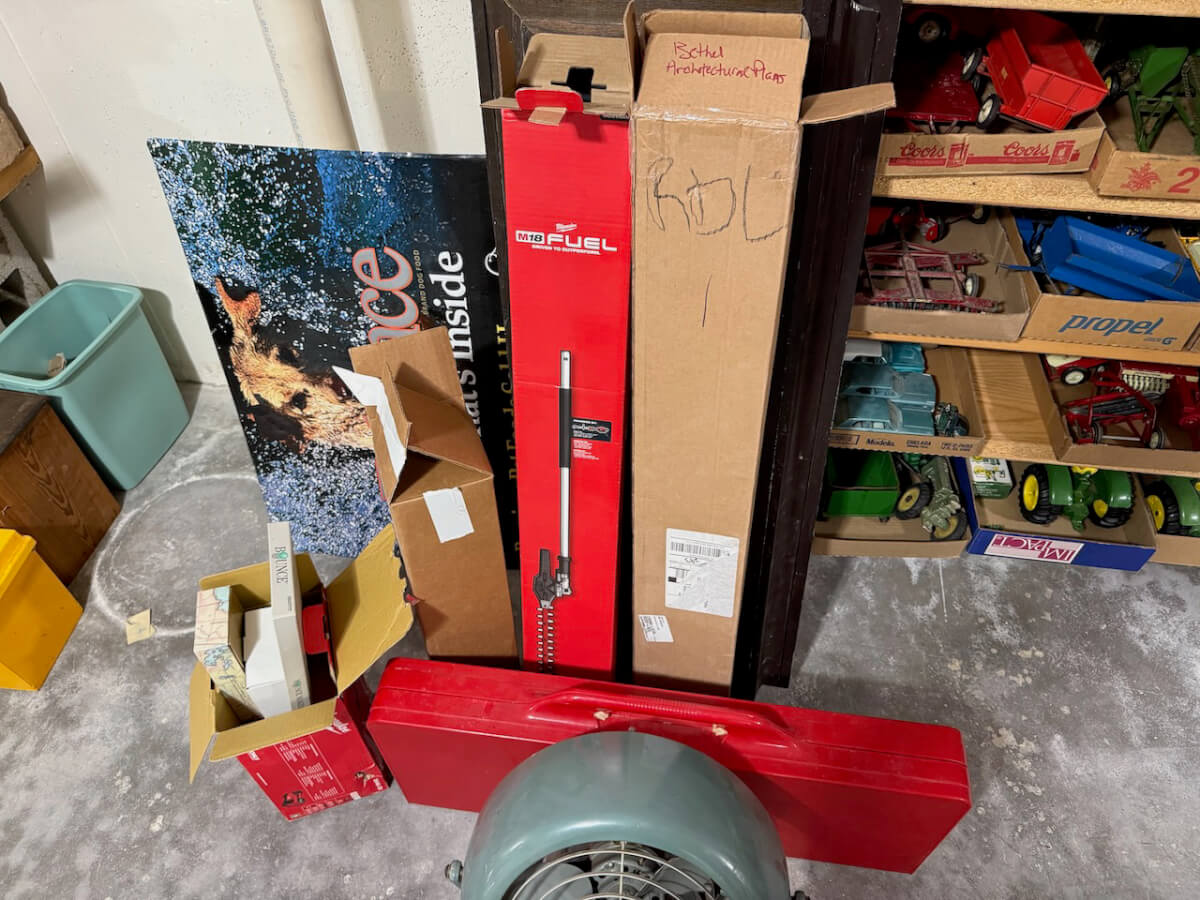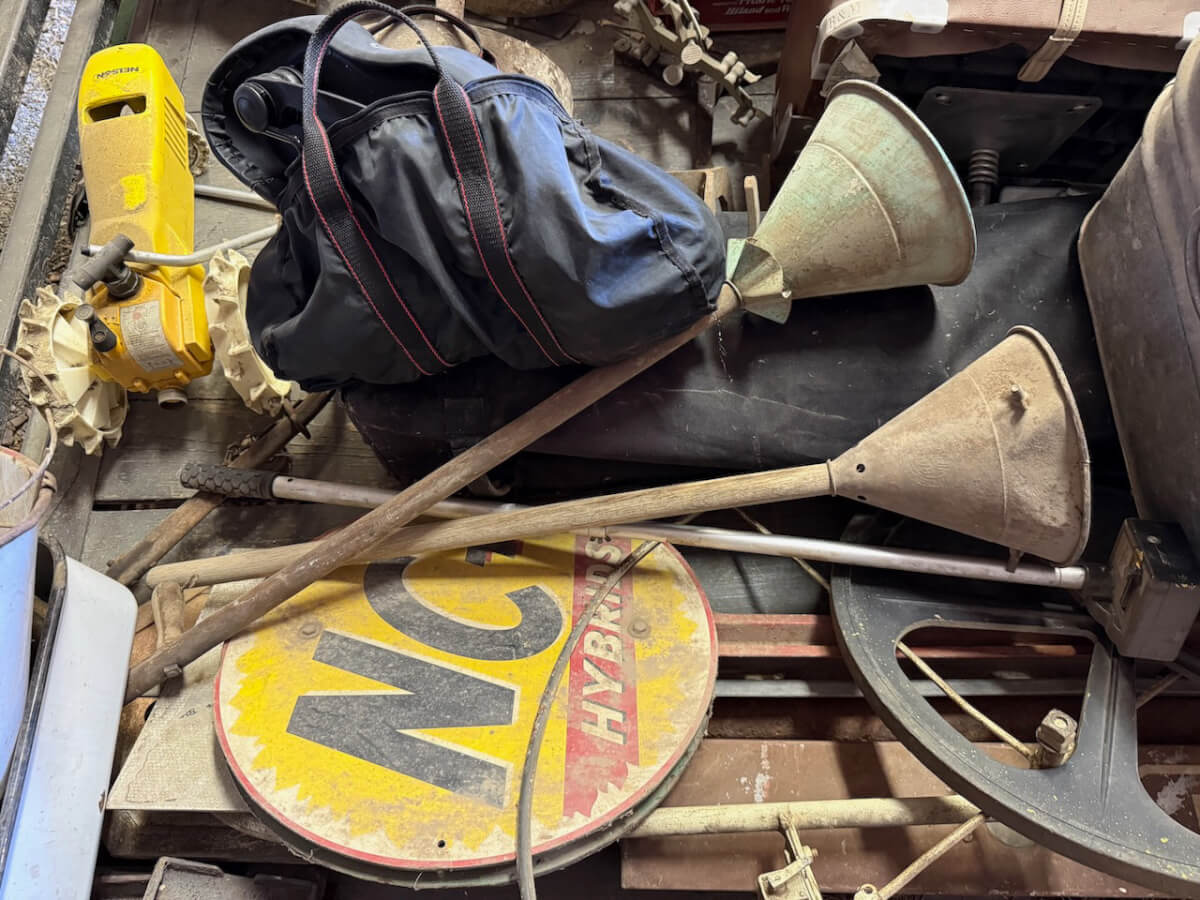 Tools & Miscellaneous: Small Planes. Plumb Bobs. Tap & Die. Sharpening Stones. Steering Wheel Knobs. Bicycle Bells. Blue Grass Catalogs. Square Nails. Sockets. Levels. Dated Nails. Surveyor Scope. Scale Weights. Hay Hook. Shapleigh Scythe Stone. Stanley Folding Rule. Leather Working Tools. Simmon, Stanley, Keen Kutter Tools. Advertising – Stanley. Shapleigh. Diamond Edge. 3 Wooden Nail Kegs. Numerous RR Hinges – ATSF. Hardware Organizer. Numerous Tool Boxes. Two Plastic Board Tool Holders. Gauges. Antique Air Pumps. Grinder. Old Water Pump. Wooden Tool Tray. Many Miscellaneous Tools. Pumps. Electric Fence Materials. Winches. Shelf & Wall Hangers. Router. Home Lite Chainsaw. Chainsaw Case. Stihl Chainsaw. Concrete Tools. Chainsaw Chains & Bars. Thunder Gun Power Washer. Jig Saw. Soldering Kit. Electric Heater. Paint Sprayer Kit. Collectible Jack. Toolbox Full of Sockets. Toolbox Full of Screwdrivers. Toolbox Full of Wrenches, Screwballs. Toolbox Full of Pliers, Vise Grips, Crescents. Box of Miscellaneous Tools. 3 Tool Belts w/Tools. Crate Full of Miscellaneous Tools. Toolbox Full of Hand Saws. Lots of Miscellaneous Wrenches & Sockets. Anvil