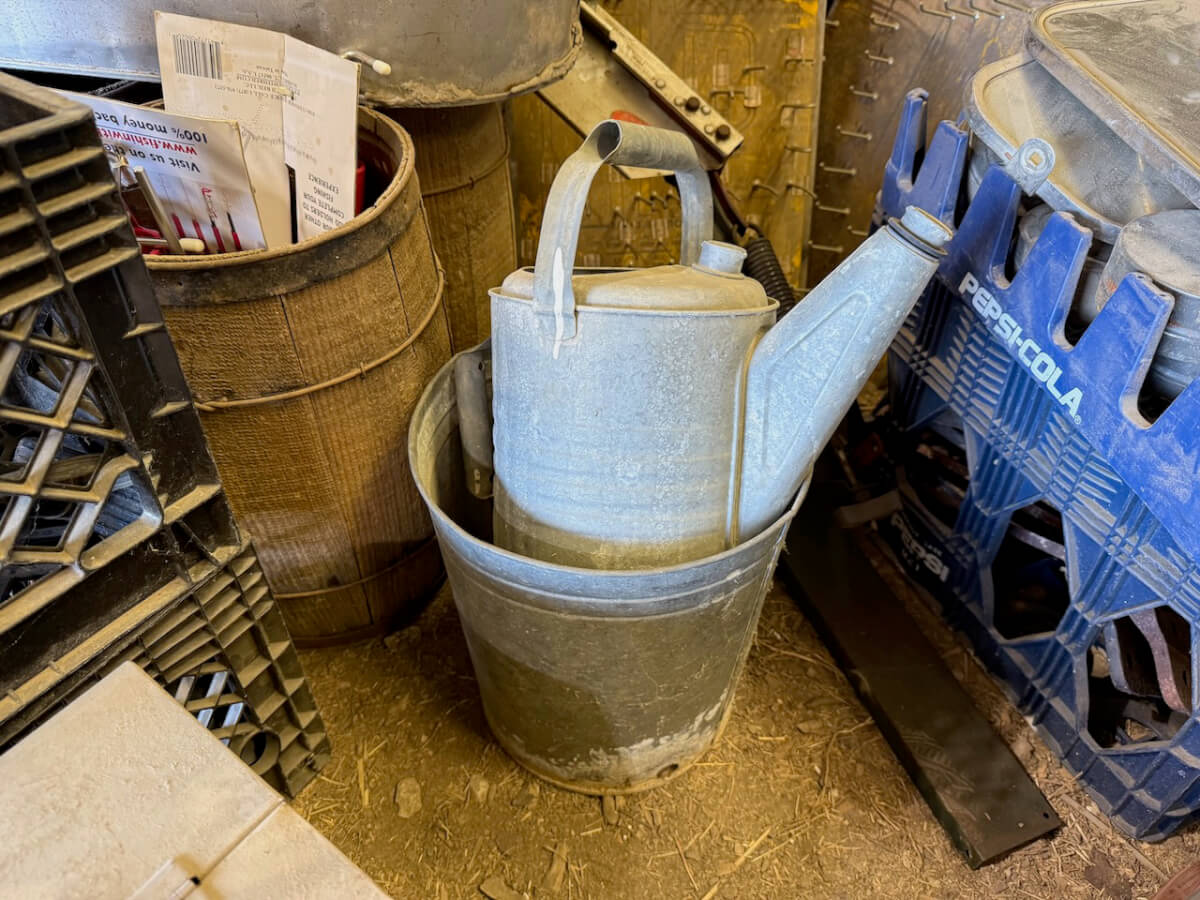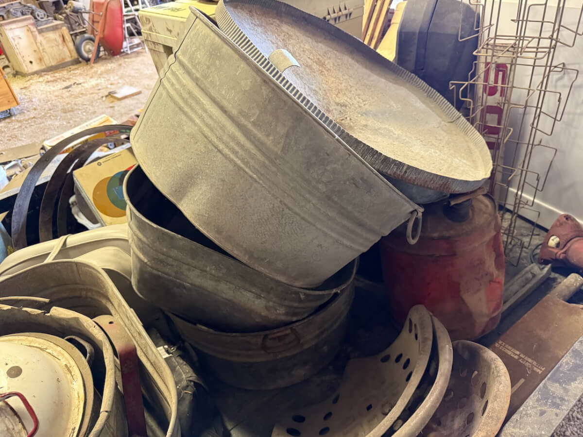 Buckets, Tubs, Cans & Granite Ware: Galvanized Watering Can. Galvanized Buckets. Several Galvanized Metal Tubs. Wash Tub. Several Pieces of Granite Ware. Metal Boiler. DX & Coop Gas Cans.