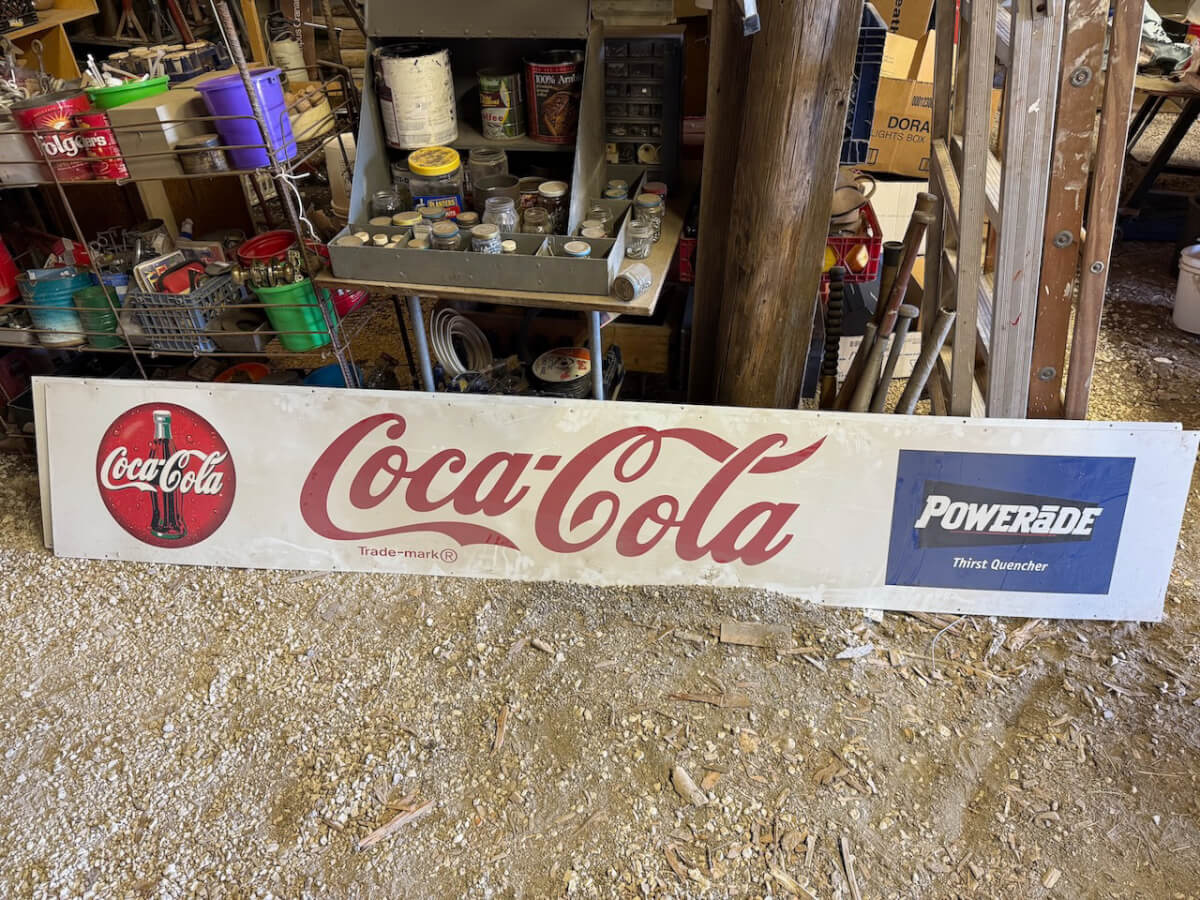 Signs: Metal Sign Texaco Sky Chief. ACCO Seeds. Leased No Trespassing. Dakota Trailers. Bi-Fold Sign Holder. Tripod Sign Hold. Gooch Seeds. 2 Rail Road Crossing. ATSF Iron. NS+ Hybrid. 3 Old Boards. 2 Plastic long Coca Cola Signs. 4 Track RR Sign