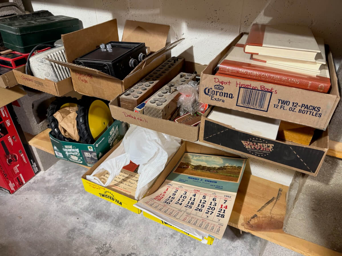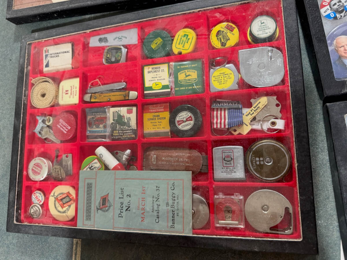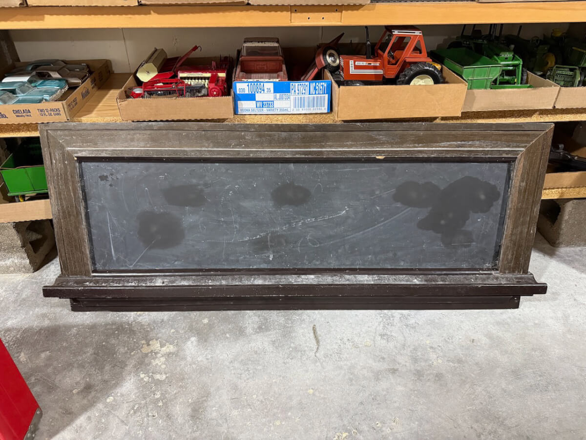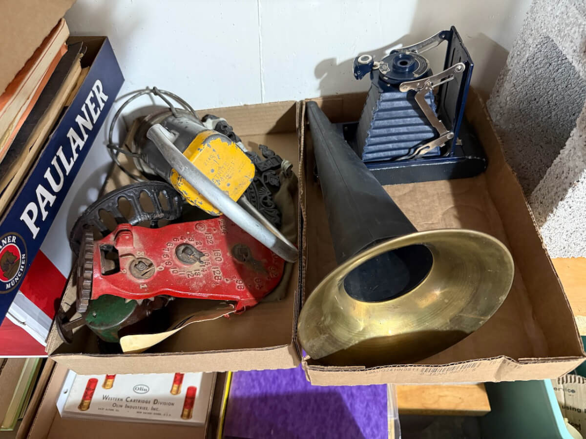 Miscellaneous: Antique Black Chalk Board. Two Flags & Two Flag Pole Holders. Old Phones. Miscellaneous Tins. Newton License Plates. Collectible Political Buttons. Guitar Tuner. Music Pitch Instrument. Henry George Cigar Box. Vintage Fire Extinguisher Ball Holders. Shapleigh Diamond Apron. Drive-in Theater Speakers. Transistor Radio. Telechron School Clock. Independent Metal Box. Hillsboro Thermometer. Cannonball. Christmas Letter Blocks. Christmas Angel. Oklahoma Collector Plates. Prince Albert Tins. Vornado Fan. Halstead Hospital Metal Plate. Lots of Miscellaneous Wooden Boxes. 2 Key Safes. Wilbur Walker Adding Machine. Vintage Glass Photo Slides. Dozens of Flour Sacks. Table Games. 2 New Galileo Thermometers. Various Sizes of Carrying Cases. John Deere Tractor Umbrella.