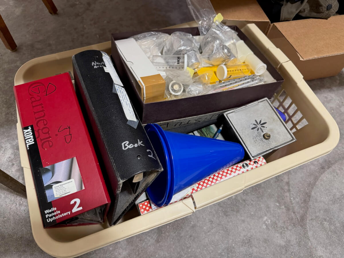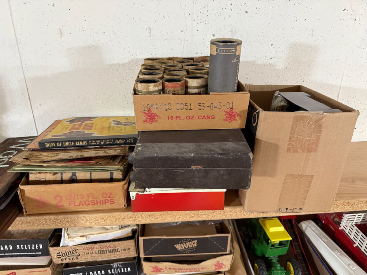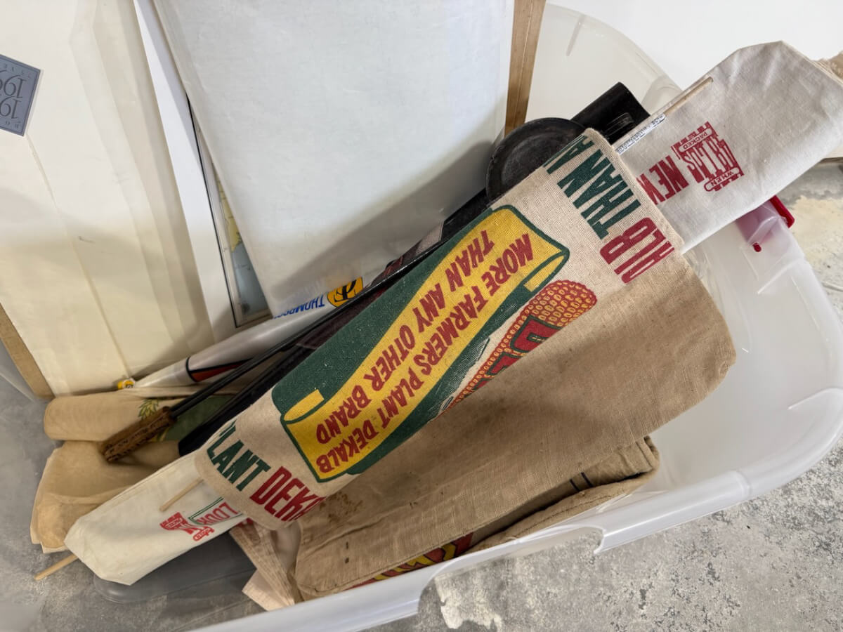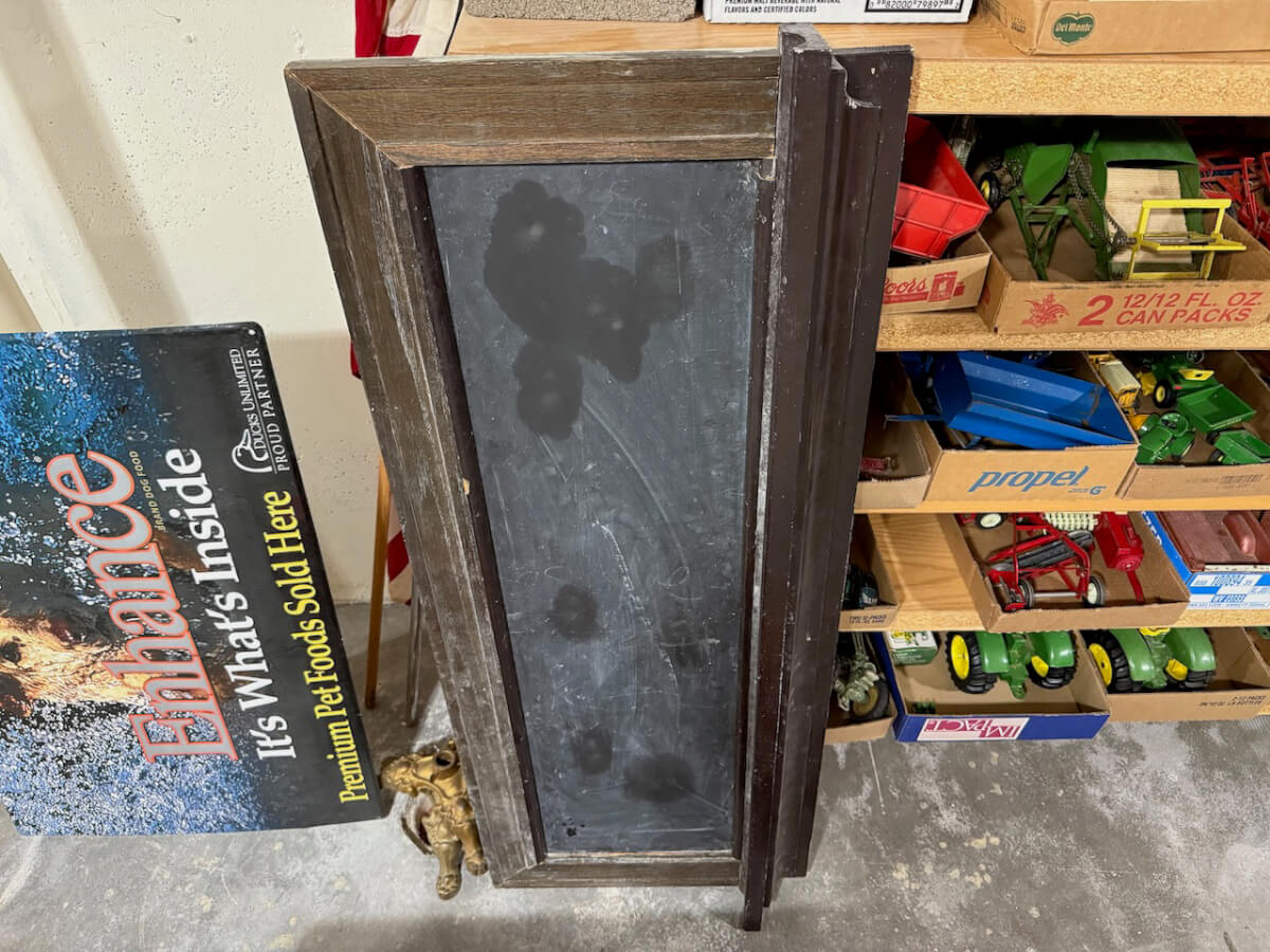 Miscellaneous: Antique Black Chalk Board. Two Flags & Two Flag Pole Holders. Old Phones. Miscellaneous Tins. Newton License Plates. Collectible Political Buttons. Guitar Tuner. Music Pitch Instrument. Henry George Cigar Box. Vintage Fire Extinguisher Ball Holders. Shapleigh Diamond Apron. Drive-in Theater Speakers. Transistor Radio. Telechron School Clock. Independent Metal Box. Hillsboro Thermometer. Cannonball. Christmas Letter Blocks. Christmas Angel. Oklahoma Collector Plates. Prince Albert Tins. Vornado Fan. Halstead Hospital Metal Plate. Lots of Miscellaneous Wooden Boxes. 2 Key Safes. Wilbur Walker Adding Machine. Vintage Glass Photo Slides. Dozens of Flour Sacks. Table Games. 2 New Galileo Thermometers. Various Sizes of Carrying Cases. John Deere Tractor Umbrella.