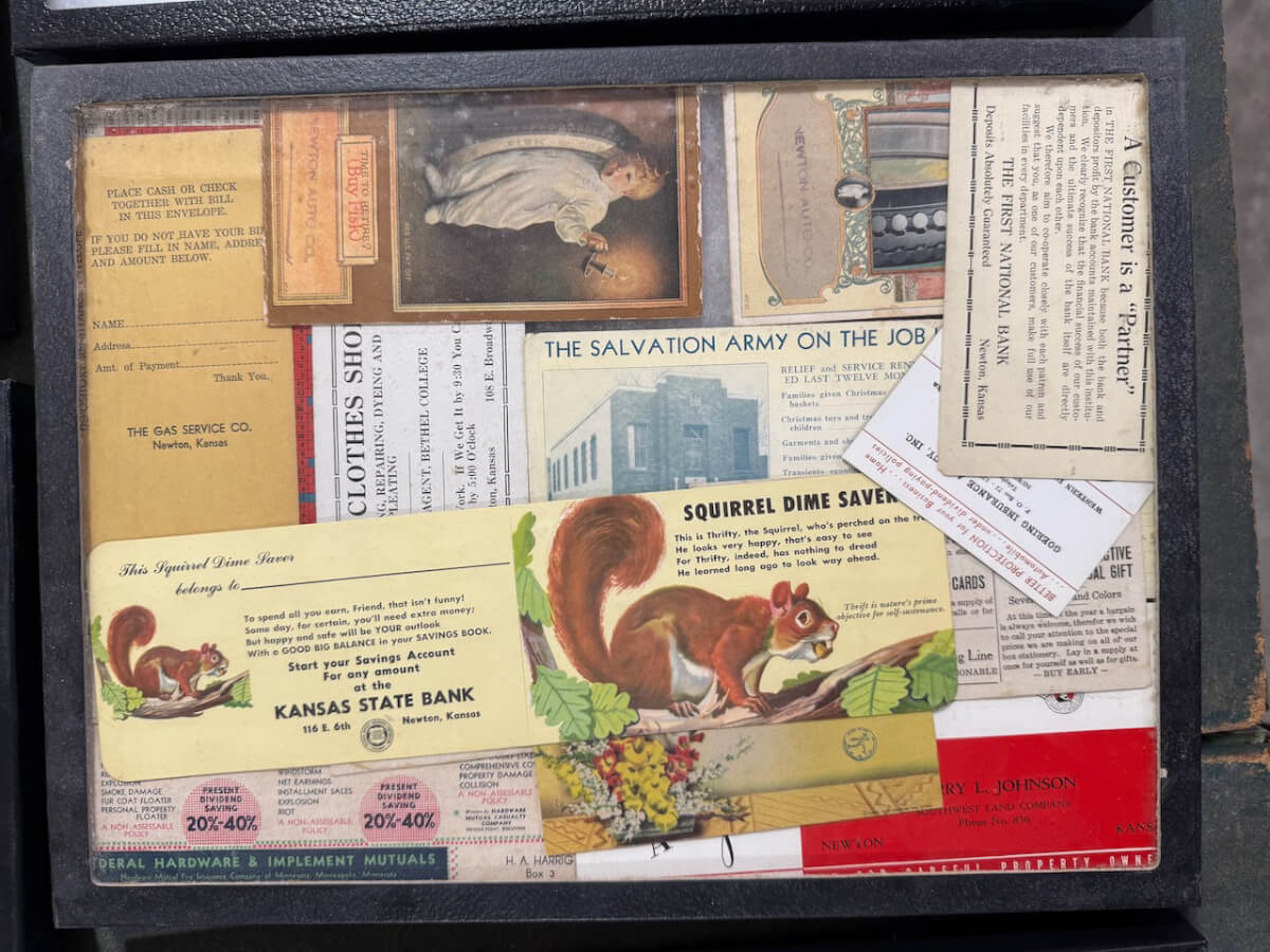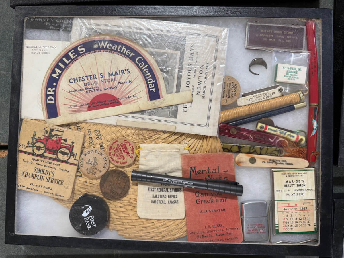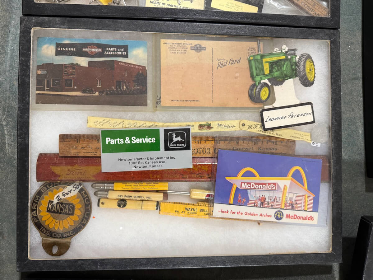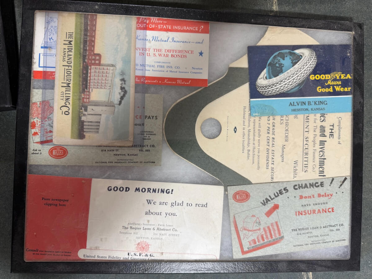 100’s of Paper Goods & Advertising: Winchester. Remington. Old Newton Business Receipts. Santa Fe. 1940s & 50s Newton HS Sports Schedules. Hardware Letter Head – Wyeth. Richards & Conover. Hibberd. Townley. Harvey County Teacher Contract. Frye Hardware. Cancelled Checks – Newton. Whitewater. Elbin. Newton Sports Programs. Railroad. Newton Business Cards & Calendars. Tools. Fred Harvey – Menu. Postcards. Farm Equipment Advertising – John Deere. Hesston. McCormick. Farmall. Hutchinson. Newton. White Water. Elbing. Burns. Winchester Wooden Sign. Shapleigh Envelopes. Skelly Oil Co Stock Yards Certificate. Wichita Union Stock Yards Certificate. Advertising Buttons. Delaval Match Holder. Pete Rose Wichita Eagle Newspaper. 1940s Wallace Farmer Magazines. Old Newton, KS Newspapers. Kansas Historical Papers. Old Newton Directories.