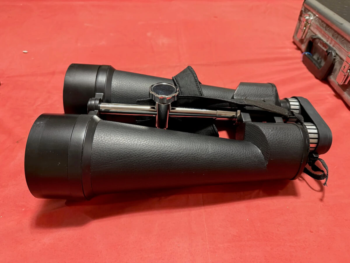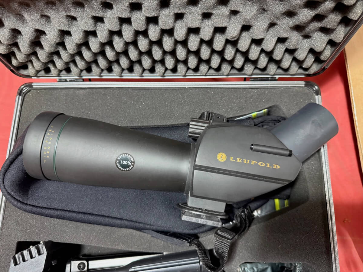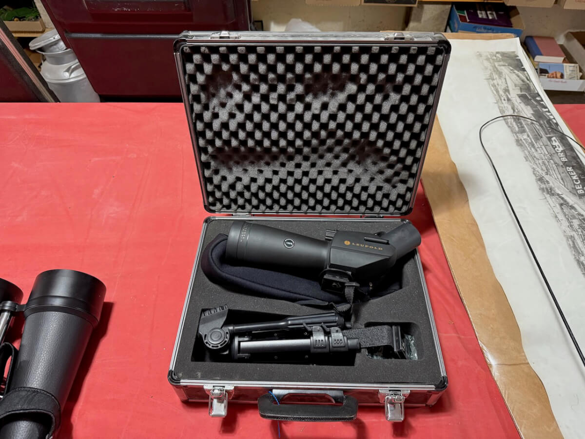 Binoculars & Scopes: Celestron 25×100 binocs in case. Leupold Spotting Scope in case. Tripods. Camera Case.