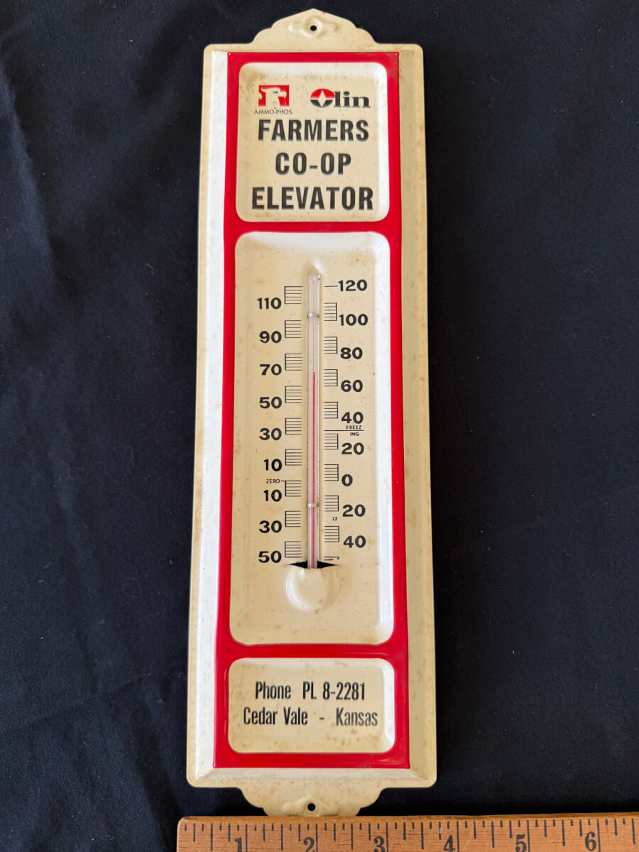 | 61 | Olin Farmers COOP Thermometer Cedar Vale Kansas 4″x13″ |