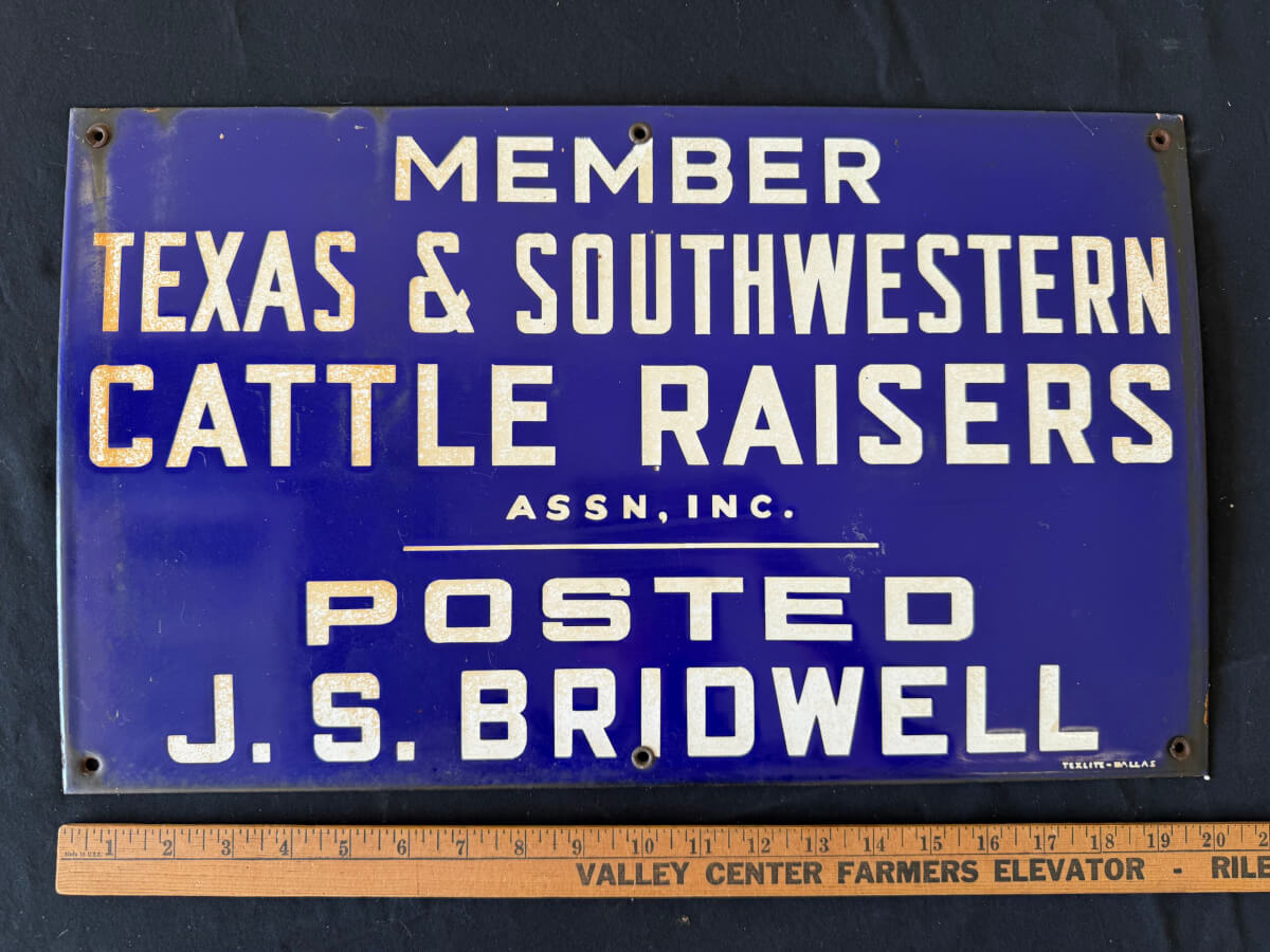 | 68 | Single Sided Porcelain Texas Southwestern Cattle Raisers Assn. J. S. Bridwell Texlight Dallas 20″x12″ |