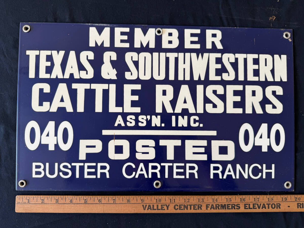 | 69 | Single Sided Porcelain Texas Southwestern Cattle Raisers Assn. Buster Carter Ranch 20″x12″ |