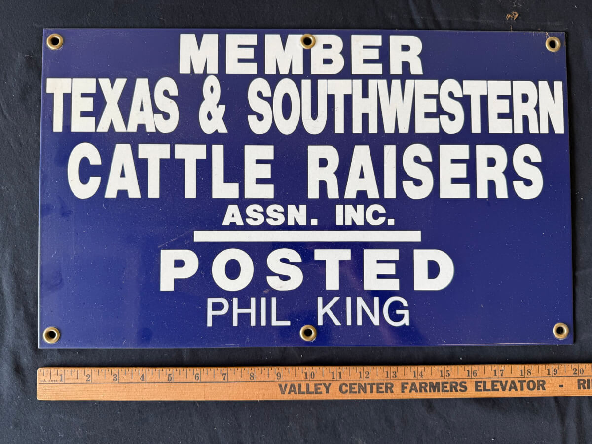 | 70 | Single Sided Porcelain Texas Southwestern Cattle Raisers Assn. Phil King 20″x12″ |