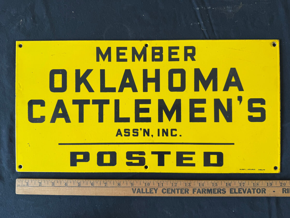 | 71 | Porcelain Single Sided Oklahoma Cattlemans Association Member Posted McMatch Axilrod Dallas 20″x10″ |
