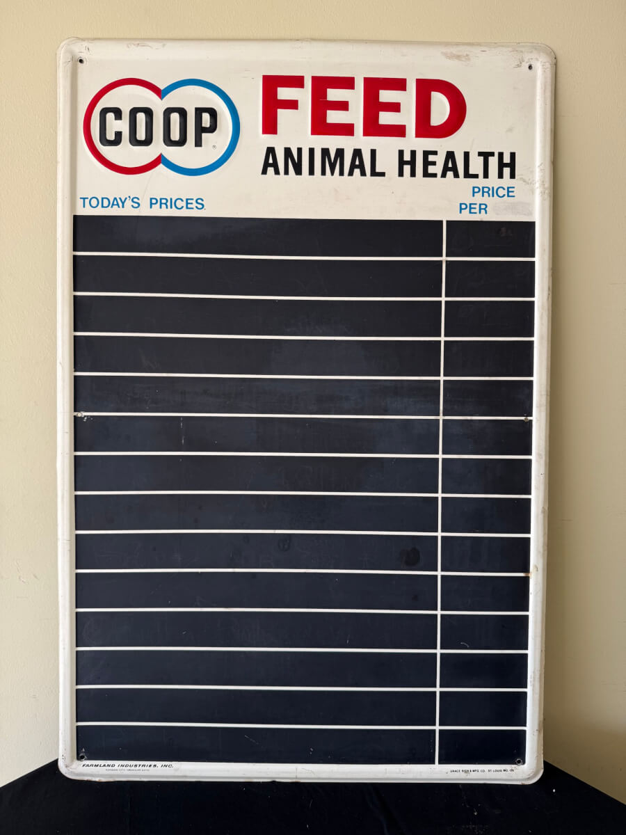 | 73 | COOP Feed Animal Health Price Board 24″x36″ Farmland Industries Kansas City Missouri Grace Sign St Louis |