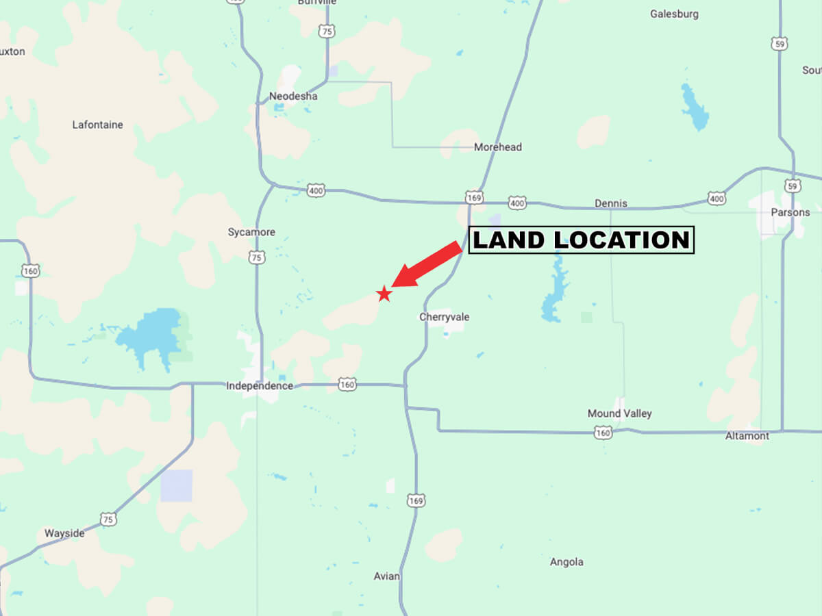 LAND LOCATION FROM CHERRYVALE: 1 mile north on Hwy 169 to county road 5200, west 1 mile to the property.
